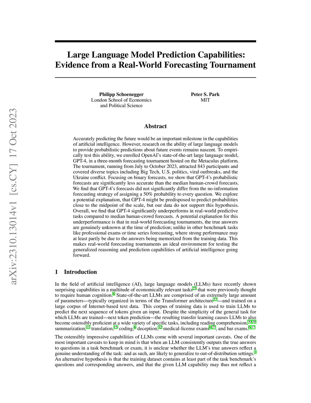 Accurately predicting the future would be an important milestone in the capabilities of artificial intelligence. However, research on the ability of large language models to provide probabilistic predictions about future events remains nascent. To empirically test this ability, we enrolled OpenAI's state-of-the-art large language model, GPT-4, in a three-month forecasting tournament hosted on the Metaculus platform. The tournament, running from July to October 2023, attracted 843 participants and covered diverse topics including Big Tech, U.S. politics, viral outbreaks, and the Ukraine conflict. Focusing on binary forecasts, we show that GPT-4's probabilistic forecasts are significantly less accurate than the median human-crowd forecasts. We find that GPT-4's forecasts did not significantly differ from the no-information forecasting strategy of assigning a 50% probability to every question. We explore a potential explanation, that GPT-4 might be predisposed to predict probabilities close to the midpoint of the scale, but our data do not support this hypothesis. Overall, we find that GPT-4 significantly underperforms in real-world predictive tasks compared to median human-crowd forecasts. A potential explanation for this underperformance is that in real-world forecasting tournaments, the true answers are genuinely unknown at the time of prediction; unlike in other benchmark tasks like professional exams or time series forecasting, where strong performance may at least partly be due to the answers being memorized from the training data. This makes real-world forecasting tournaments an ideal environment for testing the generalized reasoning and prediction capabilities of artificial intelligence going forward.