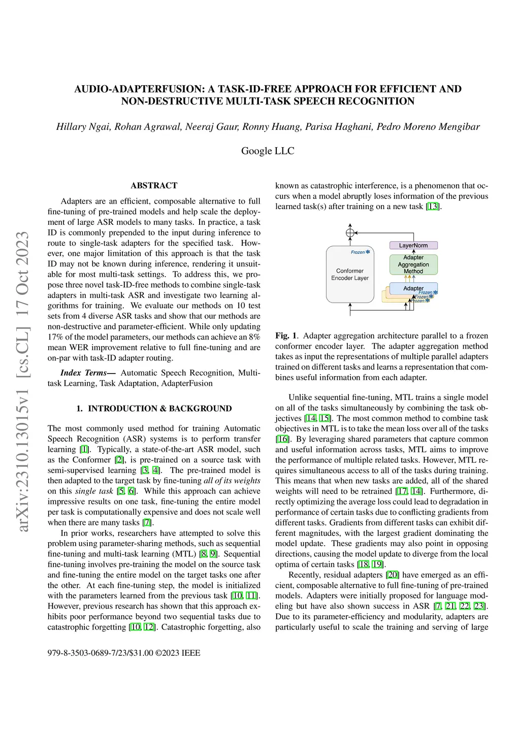 Audio-AdapterFusion: A Task-ID-free Approach for Efficient and