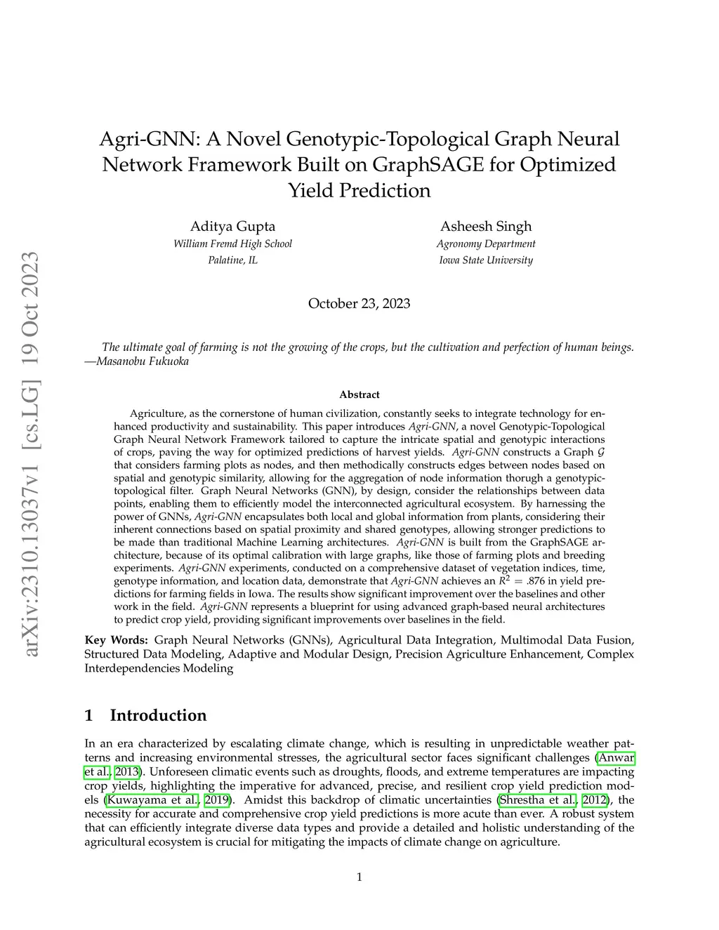 Agriculture, as the cornerstone of human civilization, constantly seeks to integrate technology for enhanced productivity and sustainability. This paper introduces , a novel Genotypic-Topological Graph Neural Network Framework tailored to capture the intricate spatial and genotypic interactions of crops, paving the way for optimized predictions of harvest yields. constructs a Graph that considers farming plots as nodes, and then methodically constructs edges between nodes based on spatial and genotypic similarity, allowing for the aggregation of node information through a genotypic-topological filter. Graph Neural Networks (GNN), by design, consider the relationships between data points, enabling them to efficiently model the interconnected agricultural ecosystem. By harnessing the power of GNNs, encapsulates both local and global information from plants, considering their inherent connections based on spatial proximity and shared genotypes, allowing stronger predictions to be made than traditional Machine Learning architectures. is built from the GraphSAGE architecture, because of its optimal calibration with large graphs, like those of farming plots and breeding experiments. experiments, conducted on a comprehensive dataset of vegetation indices, time, genotype information, and location data, demonstrate that achieves an in yield predictions for farming fields in Iowa. The results show significant improvement over the baselines and other work in the field. represents a blueprint for using advanced graph-based neural architectures to predict crop yield, providing significant improvements over baselines in the field.