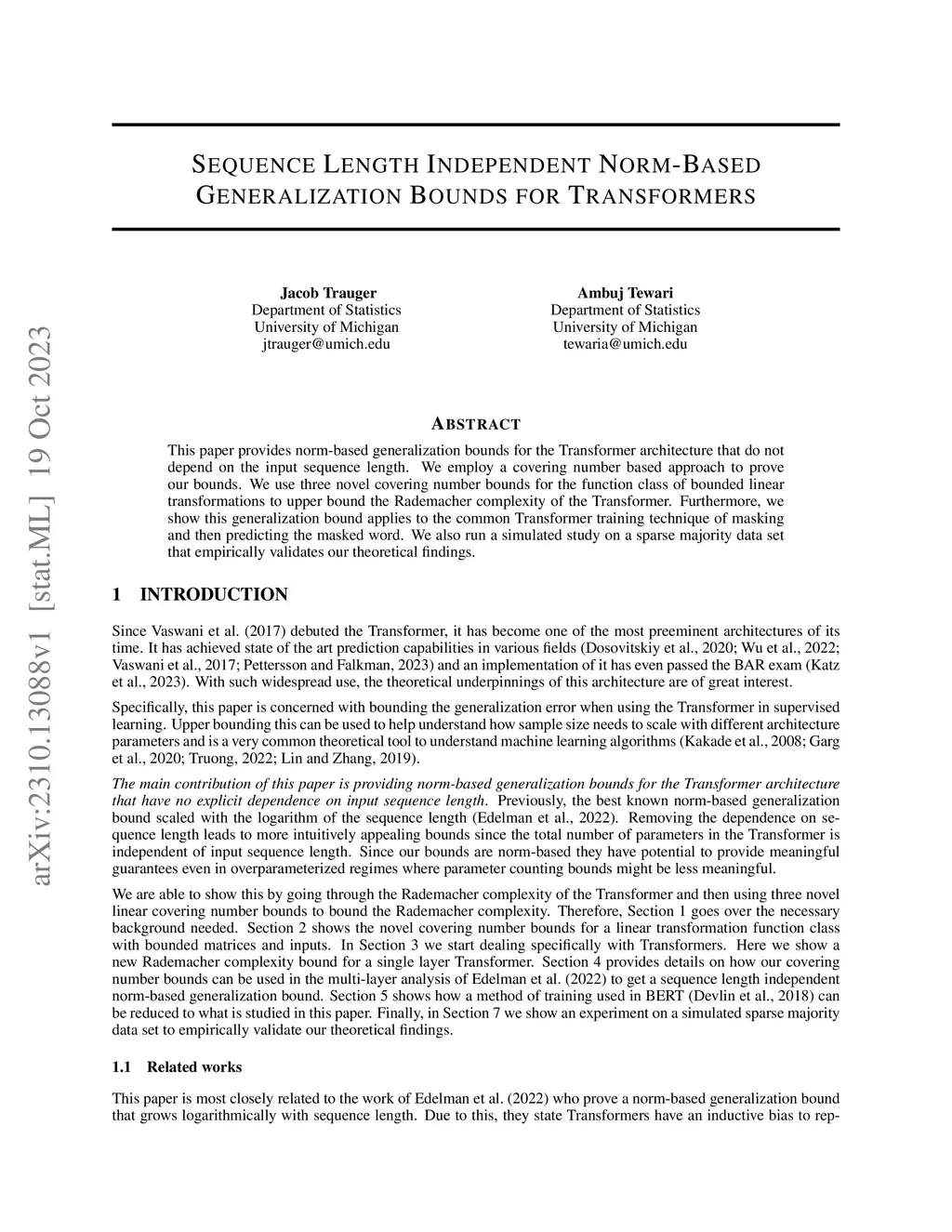 This paper provides norm-based generalization bounds for the Transformer architecture that do not depend on the input sequence length. We employ a covering number based approach to prove our bounds. We use three novel covering number bounds for the function class of bounded linear transformations to upper bound the Rademacher complexity of the Transformer. Furthermore, we show this generalization bound applies to the common Transformer training technique of masking and then predicting the masked word. We also run a simulated study on a sparse majority data set that empirically validates our theoretical findings.