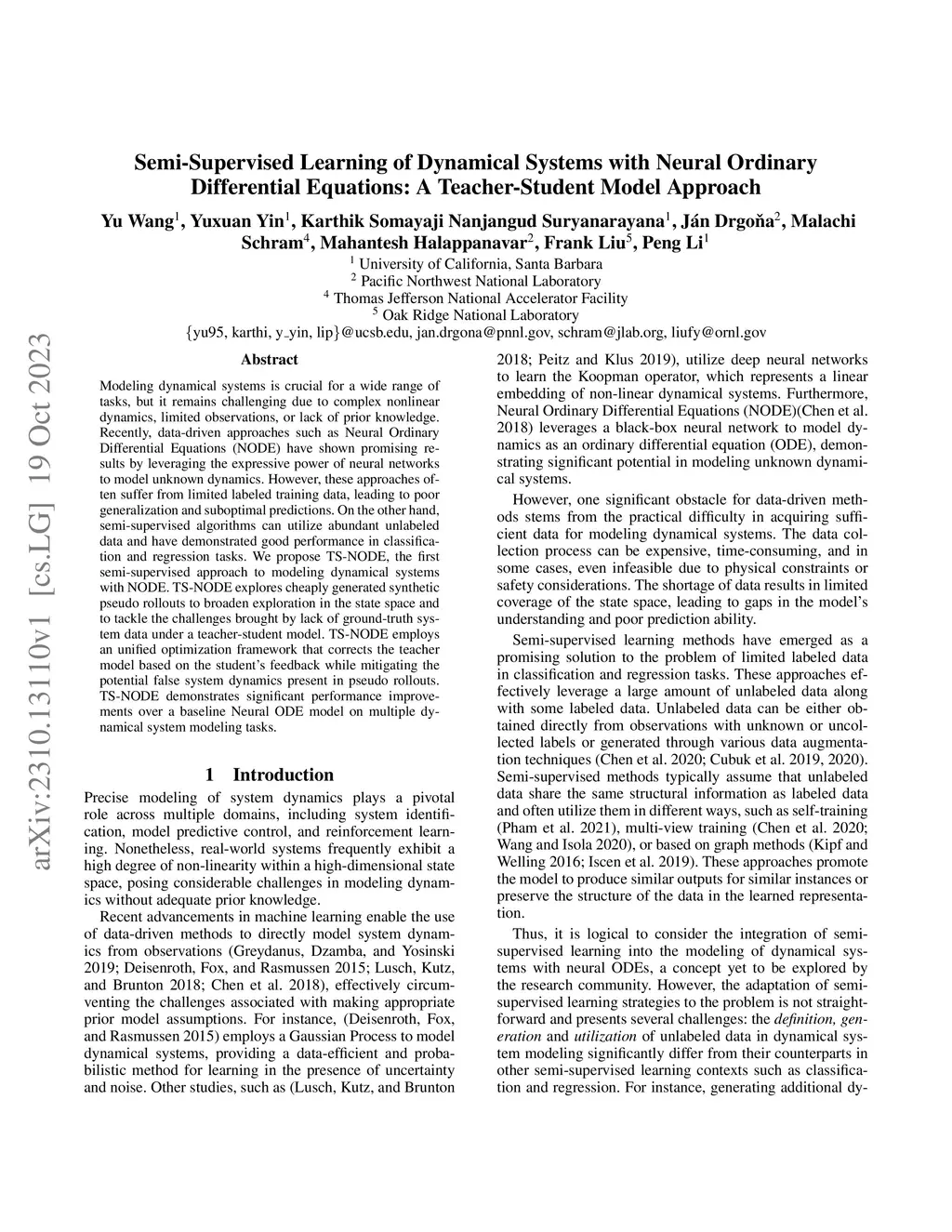 Modeling dynamical systems is crucial for a wide range of tasks, but it remains challenging due to complex nonlinear dynamics, limited observations, or lack of prior knowledge. Recently, data-driven approaches such as Neural Ordinary Differential Equations (NODE) have shown promising results by leveraging the expressive power of neural networks to model unknown dynamics. However, these approaches often suffer from limited labeled training data, leading to poor generalization and suboptimal predictions. On the other hand, semi-supervised algorithms can utilize abundant unlabeled data and have demonstrated good performance in classification and regression tasks. We propose TS-NODE, the first semi-supervised approach to modeling dynamical systems with NODE. TS-NODE explores cheaply generated synthetic pseudo rollouts to broaden exploration in the state space and to tackle the challenges brought by lack of ground-truth system data under a teacher-student model. TS-NODE employs an unified optimization framework that corrects the teacher model based on the student's feedback while mitigating the potential false system dynamics present in pseudo rollouts. TS-NODE demonstrates significant performance improvements over a baseline Neural ODE model on multiple dynamical system modeling tasks.