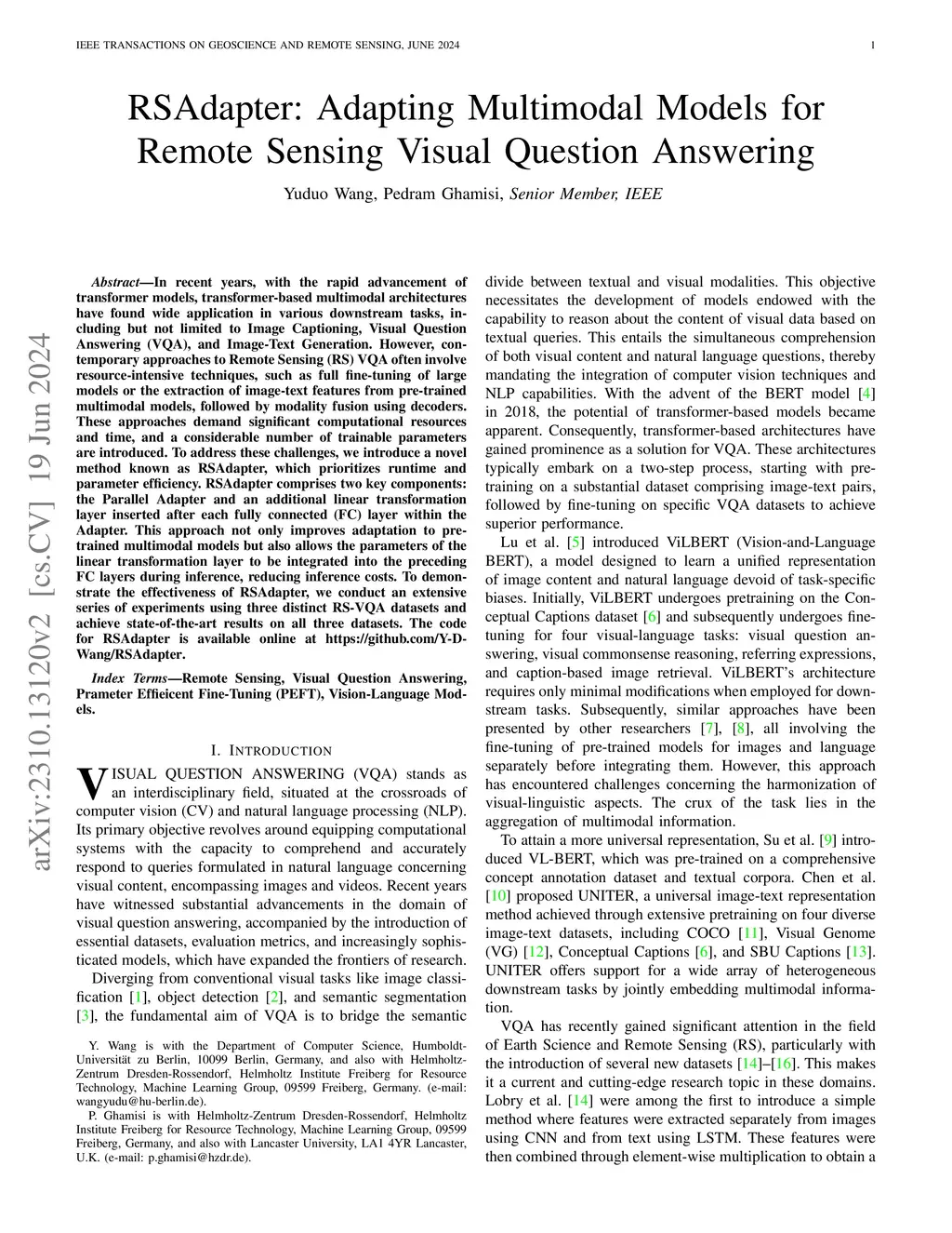 In recent years, with the rapid advancement of transformer models, transformer-based multimodal architectures have found wide application in various downstream tasks, including but not limited to Image Captioning, Visual Question Answering (VQA), and Image-Text Generation. However, contemporary approaches to Remote Sensing (RS) VQA often involve resource-intensive techniques, such as full fine-tuning of large models or the extraction of image-text features from pre-trained multimodal models, followed by modality fusion using decoders. These approaches demand significant computational resources and time, and a considerable number of trainable parameters are introduced. To address these challenges, we introduce a novel method known as RSAdapter, which prioritizes runtime and parameter efficiency. RSAdapter comprises two key components: the Parallel Adapter and an additional linear transformation layer inserted after each fully connected (FC) layer within the Adapter. This approach not only improves adaptation to pre-trained multimodal models but also allows the parameters of the linear transformation layer to be integrated into the preceding FC layers during inference, reducing inference costs. To demonstrate the effectiveness of RSAdapter, we conduct an extensive series of experiments using three distinct RS-VQA datasets and achieve state-of-the-art results on all three datasets. The code for RSAdapter is available online at https://github.com/Y-D-Wang/RSAdapter.