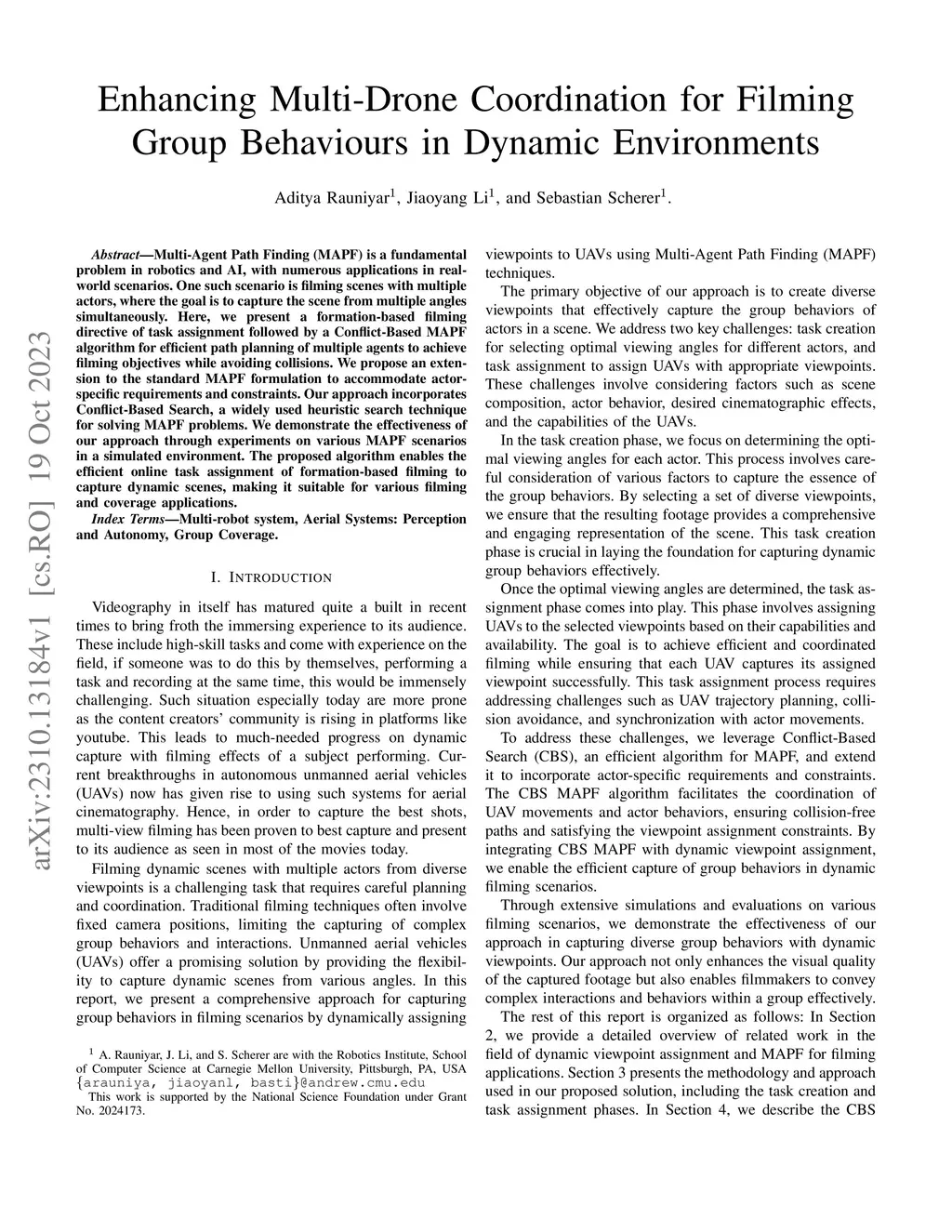 Multi-Agent Path Finding (MAPF) is a fundamental problem in robotics and AI, with numerous applications in real-world scenarios. One such scenario is filming scenes with multiple actors, where the goal is to capture the scene from multiple angles simultaneously. Here, we present a formation-based filming directive of task assignment followed by a Conflict-Based MAPF algorithm for efficient path planning of multiple agents to achieve filming objectives while avoiding collisions. We propose an extension to the standard MAPF formulation to accommodate actor-specific requirements and constraints. Our approach incorporates Conflict-Based Search, a widely used heuristic search technique for solving MAPF problems. We demonstrate the effectiveness of our approach through experiments on various MAPF scenarios in a simulated environment. The proposed algorithm enables the efficient online task assignment of formation-based filming to capture dynamic scenes, making it suitable for various filming and coverage applications.