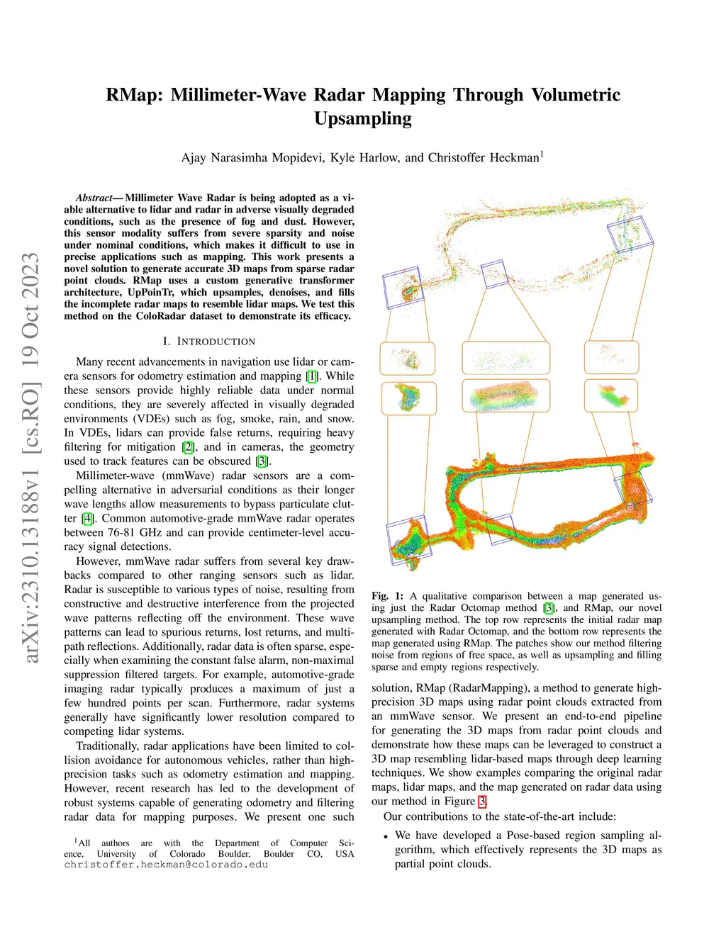 Millimeter Wave Radar is being adopted as a viable alternative to lidar and radar in adverse visually degraded conditions, such as the presence of fog and dust. However, this sensor modality suffers from severe sparsity and noise under nominal conditions, which makes it difficult to use in precise applications such as mapping. This work presents a novel solution to generate accurate 3D maps from sparse radar point clouds. RMap uses a custom generative transformer architecture, UpPoinTr, which upsamples, denoises, and fills the incomplete radar maps to resemble lidar maps. We test this method on the ColoRadar dataset to demonstrate its efficacy.