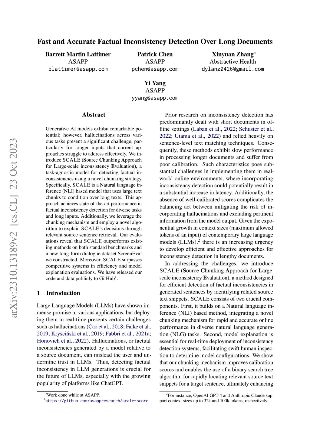 Generative AI models exhibit remarkable potential; however, hallucinations across various tasks present a significant challenge, particularly for longer inputs that current approaches struggle to address effectively. We introduce SCALE (Source Chunking Approach for Large-scale inconsistency Evaluation), a task-agnostic model for detecting factual inconsistencies using a novel chunking strategy. Specifically, SCALE is a Natural Language Inference (NLI) based model that uses large text chunks to condition over long texts. This approach achieves state-of-the-art performance in factual inconsistency detection for diverse tasks and long inputs. Additionally, we leverage the chunking mechanism and employ a novel algorithm to explain SCALE's decisions through relevant source sentence retrieval. Our evaluations reveal that SCALE outperforms existing methods on both standard benchmarks and a new long-form dialogue dataset ScreenEval we constructed. Moreover, SCALE surpasses competitive systems in efficiency and model explanation evaluations. We have released our code and data publicly to GitHub.
