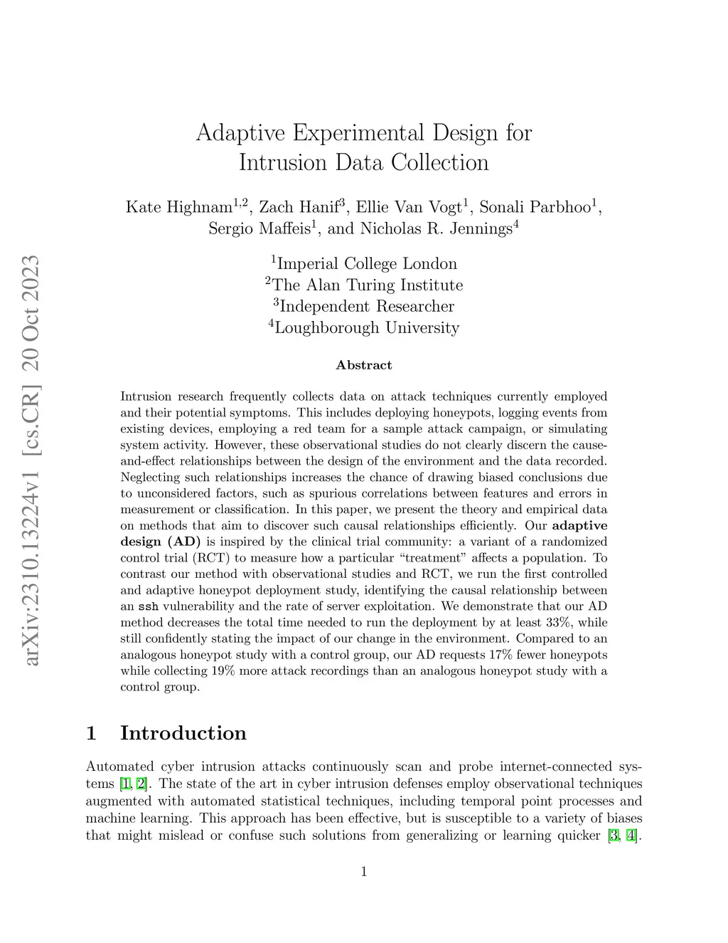 Intrusion research frequently collects data on attack techniques currently employed and their potential symptoms. This includes deploying honeypots, logging events from existing devices, employing a red team for a sample attack campaign, or simulating system activity. However, these observational studies do not clearly discern the cause-and-effect relationships between the design of the environment and the data recorded. Neglecting such relationships increases the chance of drawing biased conclusions due to unconsidered factors, such as spurious correlations between features and errors in measurement or classification. In this paper, we present the theory and empirical data on methods that aim to discover such causal relationships efficiently. Our adaptive design (AD) is inspired by the clinical trial community: a variant of a randomized control trial (RCT) to measure how a particular ``treatment'' affects a population. To contrast our method with observational studies and RCT, we run the first controlled and adaptive honeypot deployment study, identifying the causal relationship between an ssh vulnerability and the rate of server exploitation. We demonstrate that our AD method decreases the total time needed to run the deployment by at least 33%, while still confidently stating the impact of our change in the environment. Compared to an analogous honeypot study with a control group, our AD requests 17% fewer honeypots while collecting 19% more attack recordings than an analogous honeypot study with a control group.