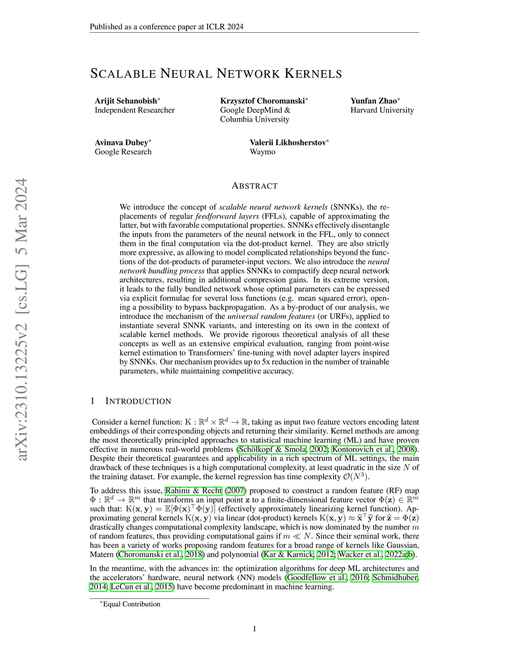 We introduce the concept of scalable neural network kernels (SNNKs), the replacements of regular feedforward layers (FFLs), capable of approximating the latter, but with favorable computational properties. SNNKs effectively disentangle the inputs from the parameters of the neural network in the FFL, only to connect them in the final computation via the dot-product kernel. They are also strictly more expressive, as allowing to model complicated relationships beyond the functions of the dot-products of parameter-input vectors. We also introduce the neural network bundling process that applies SNNKs to compactify deep neural network architectures, resulting in additional compression gains. In its extreme version, it leads to the fully bundled network whose optimal parameters can be expressed via explicit formulae for several loss functions (e.g. mean squared error), opening a possibility to bypass backpropagation. As a by-product of our analysis, we introduce the mechanism of the universal random features (or URFs), applied to instantiate several SNNK variants, and interesting on its own in the context of scalable kernel methods. We provide rigorous theoretical analysis of all these concepts as well as an extensive empirical evaluation, ranging from point-wise kernel estimation to Transformers' fine-tuning with novel adapter layers inspired by SNNKs. Our mechanism provides up to 5x reduction in the number of trainable parameters, while maintaining competitive accuracy.