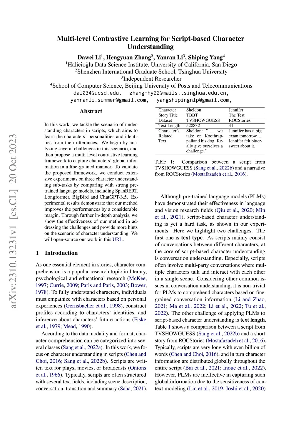 In this work, we tackle the scenario of understanding characters in scripts, which aims to learn the characters' personalities and identities from their utterances. We begin by analyzing several challenges in this scenario, and then propose a multi-level contrastive learning framework to capture characters' global information in a fine-grained manner. To validate the proposed framework, we conduct extensive experiments on three character understanding sub-tasks by comparing with strong pre-trained language models, including SpanBERT, Longformer, BigBird and ChatGPT-3.5. Experimental results demonstrate that our method improves the performances by a considerable margin. Through further in-depth analysis, we show the effectiveness of our method in addressing the challenges and provide more hints on the scenario of character understanding. We will open-source our work on github at https://github.com/David-Li0406/Script-based-Character-Understanding.