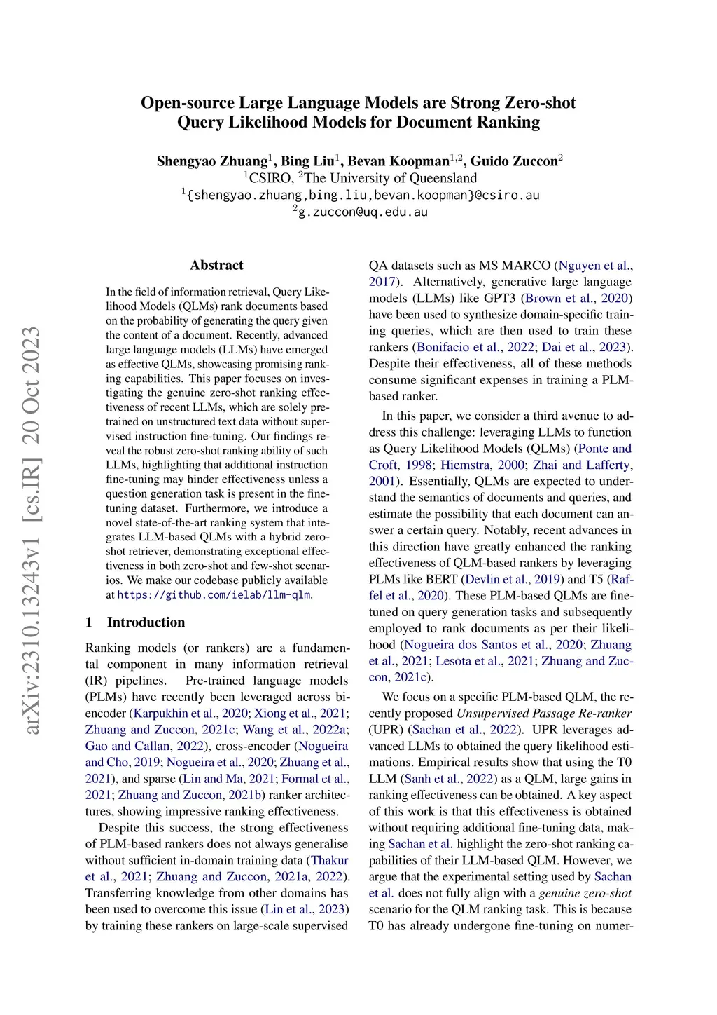 In the field of information retrieval, Query Likelihood Models (QLMs) rank documents based on the probability of generating the query given the content of a document. Recently, advanced large language models (LLMs) have emerged as effective QLMs, showcasing promising ranking capabilities. This paper focuses on investigating the genuine zero-shot ranking effectiveness of recent LLMs, which are solely pre-trained on unstructured text data without supervised instruction fine-tuning. Our findings reveal the robust zero-shot ranking ability of such LLMs, highlighting that additional instruction fine-tuning may hinder effectiveness unless a question generation task is present in the fine-tuning dataset. Furthermore, we introduce a novel state-of-the-art ranking system that integrates LLM-based QLMs with a hybrid zero-shot retriever, demonstrating exceptional effectiveness in both zero-shot and few-shot scenarios. We make our codebase publicly available at https://github.com/ielab/llm-qlm.