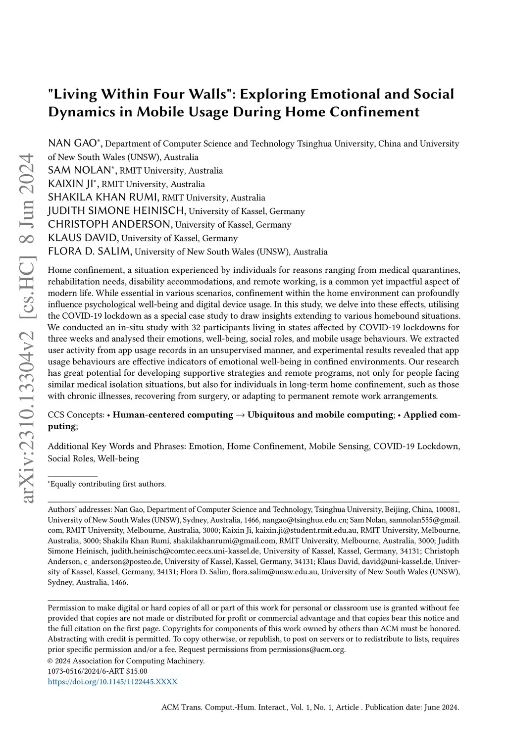Pandemics and epidemics have been an essential part of human history. It has powerfully shaped human civilization, affecting politics, economics, medicine, and everyday human lives. Home confinement, one of the social isolation restrictions, has proven to be an effective way to prevent a pandemic and significantly reduce the spread of the virus. However, these measures have also led to negative psychological effects, which can be more severe than the physical discomfort caused by the pandemic itself. To address this issue, it is crucial to understand how being confined at home affects people's psychological states and their use of digital devices. To this end, we conducted an in-situ study with 32 participants living in states affected by COVID-19 lockdowns for three weeks. We examined human emotions, social roles, well-being, and mobile usage behaviors and explored the predictability of affective states using digital traces. Extensive experimental results show that COVID-19 home confinement is associated with decreased valence and increased work time and that human well-being could be accurately inferred from mobile usage behaviors. We also present a set of interesting findings on how different factors of mobile usage affect human emotions. Overall, the findings of this research have great potential to inform the development of interventions and remote programs to support individuals in similar situations, such as those who are ill or undergoing post-operative home rehabilitation and home work.