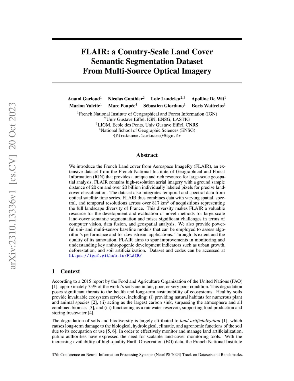 We introduce the French Land cover from Aerospace ImageRy (FLAIR), an extensive dataset from the French National Institute of Geographical and Forest Information (IGN) that provides a unique and rich resource for large-scale geospatial analysis. FLAIR contains high-resolution aerial imagery with a ground sample distance of 20 cm and over 20 billion individually labeled pixels for precise land-cover classification. The dataset also integrates temporal and spectral data from optical satellite time series. FLAIR thus combines data with varying spatial, spectral, and temporal resolutions across over 817 km2 of acquisitions representing the full landscape diversity of France. This diversity makes FLAIR a valuable resource for the development and evaluation of novel methods for large-scale land-cover semantic segmentation and raises significant challenges in terms of computer vision, data fusion, and geospatial analysis. We also provide powerful uni- and multi-sensor baseline models that can be employed to assess algorithm's performance and for downstream applications. Through its extent and the quality of its annotation, FLAIR aims to spur improvements in monitoring and understanding key anthropogenic development indicators such as urban growth, deforestation, and soil artificialization. Dataset and codes can be accessed at https://ignf.github.io/FLAIR/