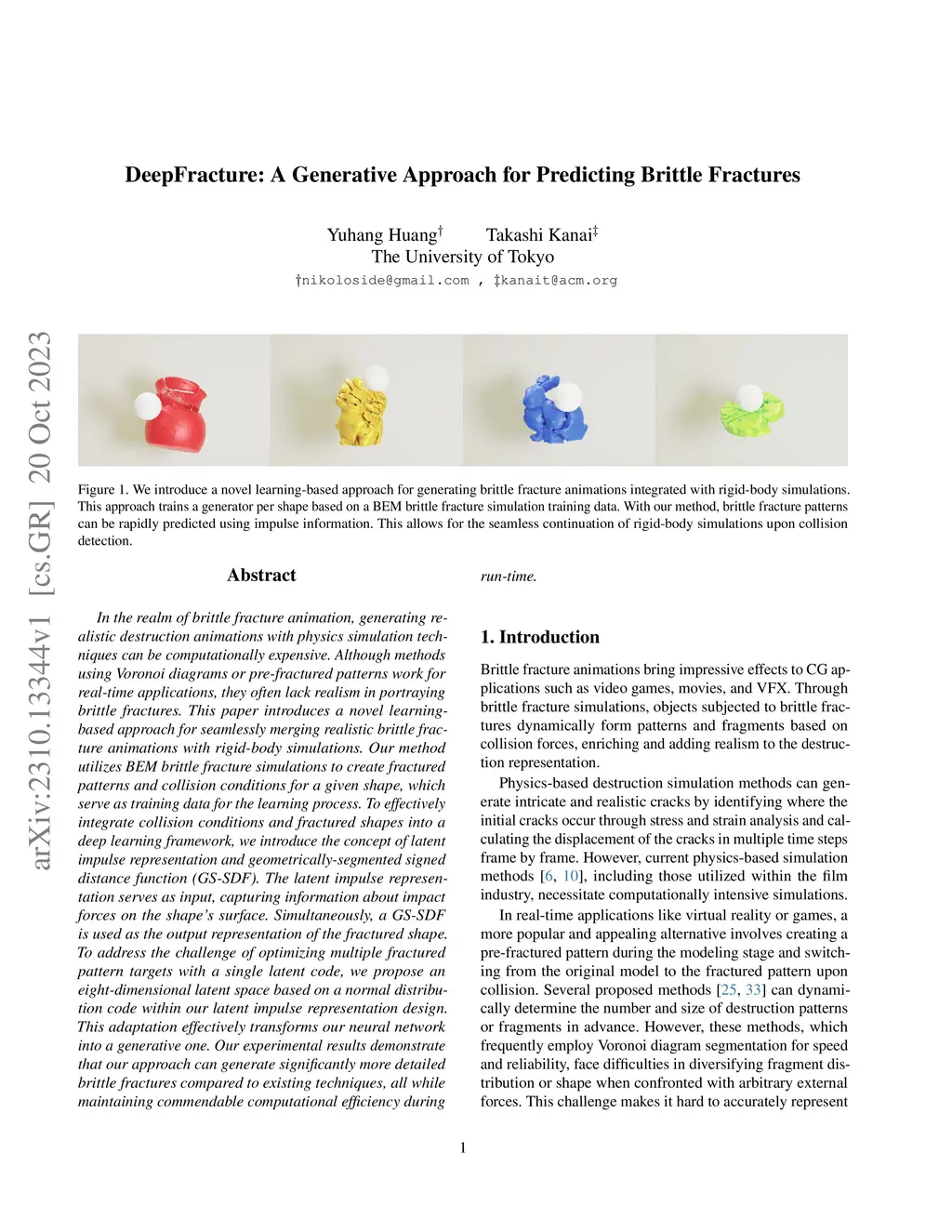 In the field of brittle fracture animation, generating realistic destruction animations using physics-based simulation methods is computationally expensive. While techniques based on Voronoi diagrams or pre-fractured patterns are effective for real-time applications, they fail to incorporate collision conditions when determining fractured shapes during runtime. This paper introduces a novel learning-based approach for predicting fractured shapes based on collision dynamics at runtime. Our approach seamlessly integrates realistic brittle fracture animations with rigid body simulations, utilising boundary element method (BEM) brittle fracture simulations to generate training data. To integrate collision scenarios and fractured shapes into a deep learning framework, we introduce generative geometric segmentation, distinct from both instance and semantic segmentation, to represent 3D fragment shapes. We propose an eight-dimensional latent code to address the challenge of optimising multiple discrete fracture pattern targets that share similar continuous collision latent codes. This code will follow a discrete normal distribution corresponding to a specific fracture pattern within our latent impulse representation design. This adaptation enables the prediction of fractured shapes using neural discrete representation learning. Our experimental results show that our approach generates considerably more detailed brittle fractures than existing techniques, while the computational time is typically reduced compared to traditional simulation methods at comparable resolutions.