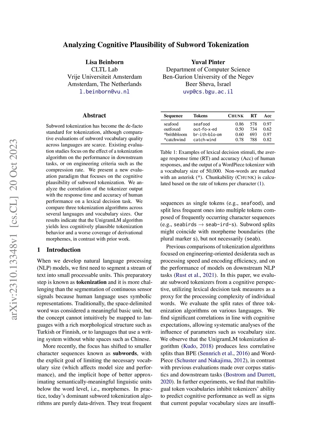 Subword tokenization has become the de-facto standard for tokenization, although comparative evaluations of subword vocabulary quality across languages are scarce. Existing evaluation studies focus on the effect of a tokenization algorithm on the performance in downstream tasks, or on engineering criteria such as the compression rate. We present a new evaluation paradigm that focuses on the cognitive plausibility of subword tokenization. We analyze the correlation of the tokenizer output with the response time and accuracy of human performance on a lexical decision task. We compare three tokenization algorithms across several languages and vocabulary sizes. Our results indicate that the UnigramLM algorithm yields less cognitively plausible tokenization behavior and a worse coverage of derivational morphemes, in contrast with prior work.