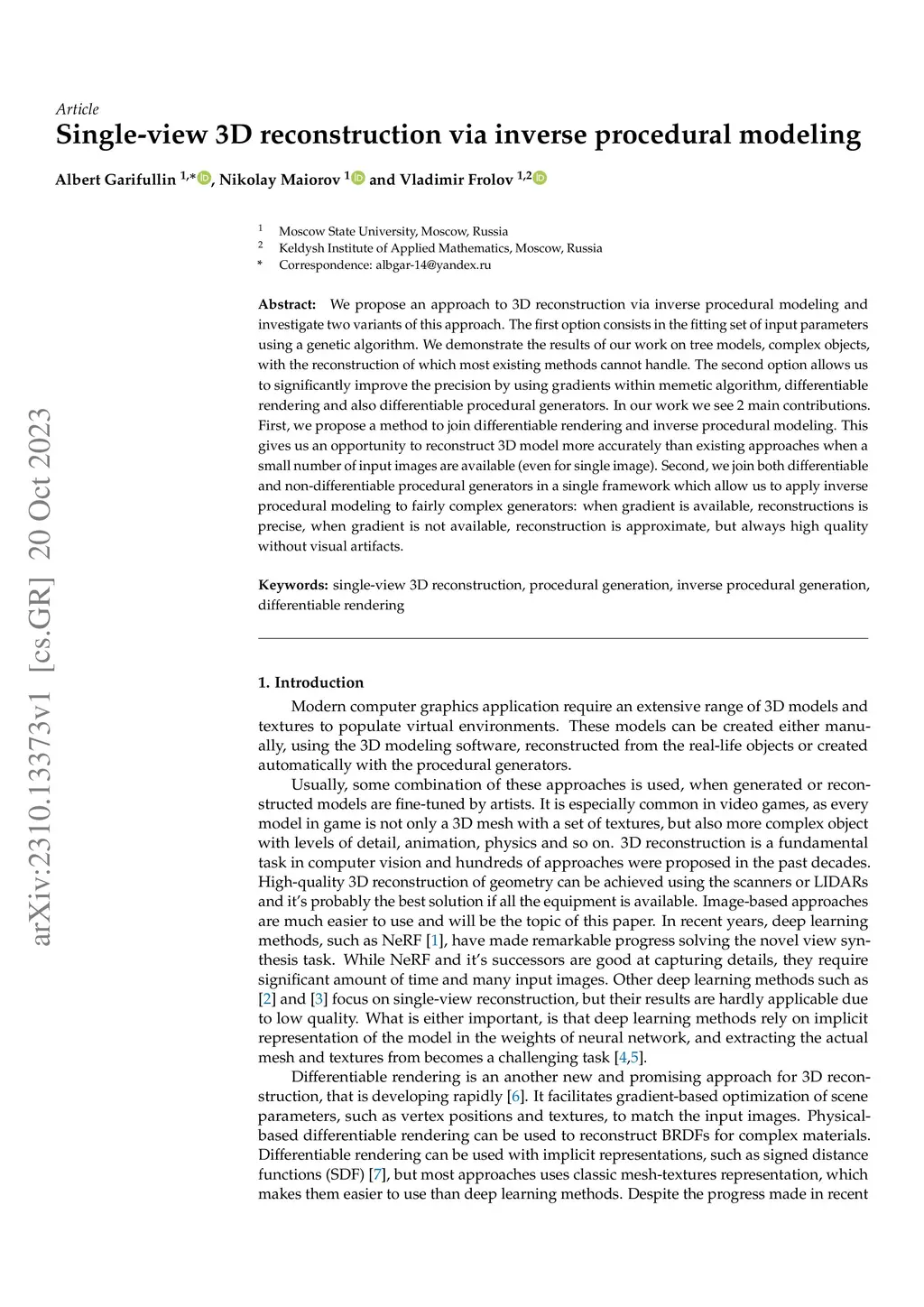 We propose an approach to 3D reconstruction via inverse procedural modeling and investigate two variants of this approach. The first option consists in the fitting set of input parameters using a genetic algorithm. We demonstrate the results of our work on tree models, complex objects, with the reconstruction of which most existing methods cannot handle. The second option allows us to significantly improve the precision by using gradients within memetic algorithm, differentiable rendering and also differentiable procedural generators. In our work we see 2 main contributions. First, we propose a method to join differentiable rendering and inverse procedural modeling. This gives us an opportunity to reconstruct 3D model more accurately than existing approaches when a small number of input images are available (even for single image). Second, we join both differentiable and non-differentiable procedural generators in a single framework which allow us to apply inverse procedural modeling to fairly complex generators: when gradient is available, reconstructions is precise, when gradient is not available, reconstruction is approximate, but always high quality without visual artifacts.