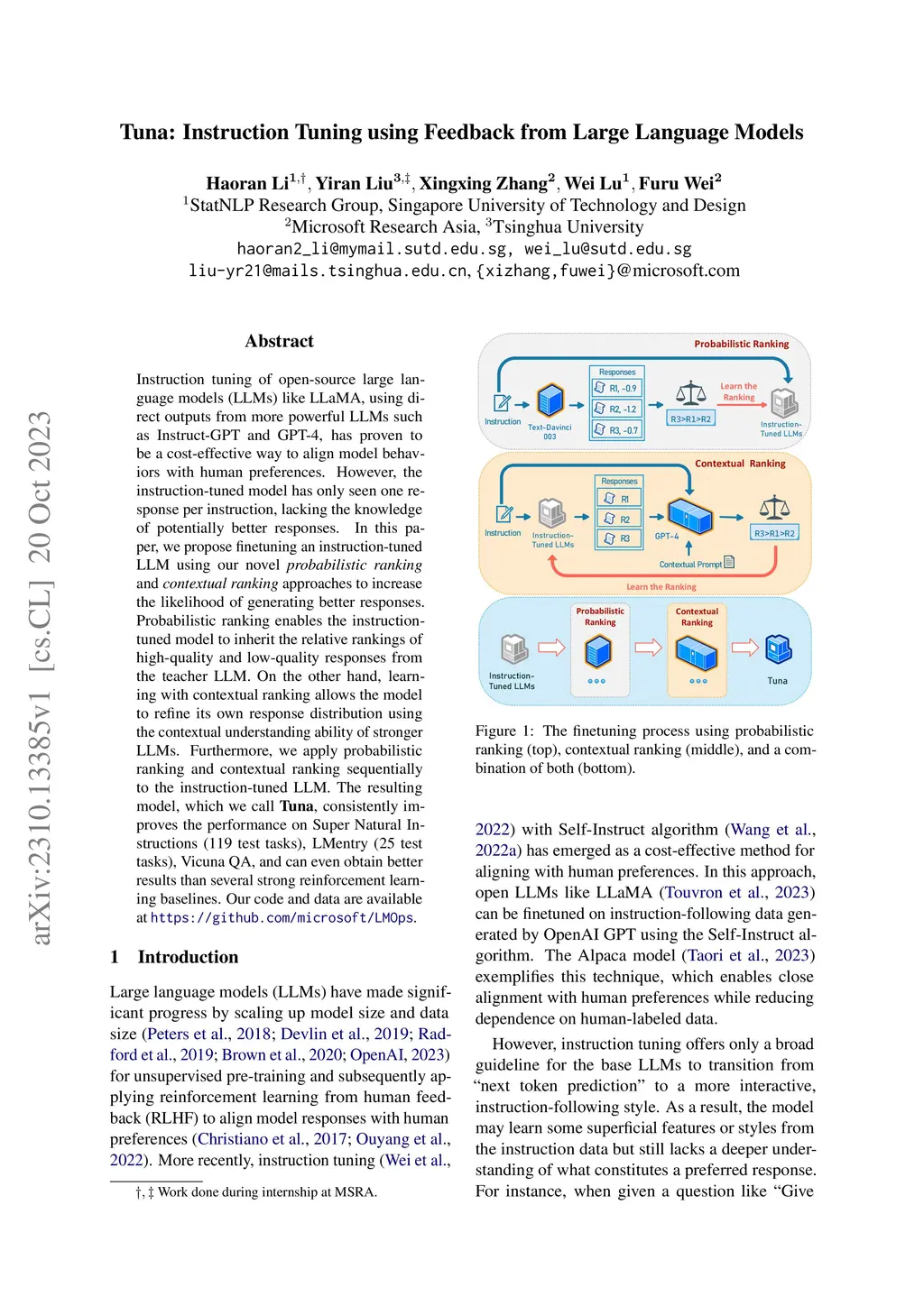 Instruction tuning of open-source large language models (LLMs) like LLaMA, using direct outputs from more powerful LLMs such as Instruct-GPT and GPT-4, has proven to be a cost-effective way to align model behaviors with human preferences. However, the instruction-tuned model has only seen one response per instruction, lacking the knowledge of potentially better responses. In this paper, we propose finetuning an instruction-tuned LLM using our novel \textit{probabilistic ranking} and \textit{contextual ranking} approaches to increase the likelihood of generating better responses. Probabilistic ranking enables the instruction-tuned model to inherit the relative rankings of high-quality and low-quality responses from the teacher LLM. On the other hand, learning with contextual ranking allows the model to refine its own response distribution using the contextual understanding ability of stronger LLMs. Furthermore, we apply probabilistic ranking and contextual ranking sequentially to the instruction-tuned LLM. The resulting model, which we call \textbf{Tuna}, consistently improves the performance on Super Natural Instructions (119 test tasks), LMentry (25 test tasks), Vicuna QA, and can even obtain better results than several strong reinforcement learning baselines. Our code and data are available at \url{ https://github.com/microsoft/LMOps}.