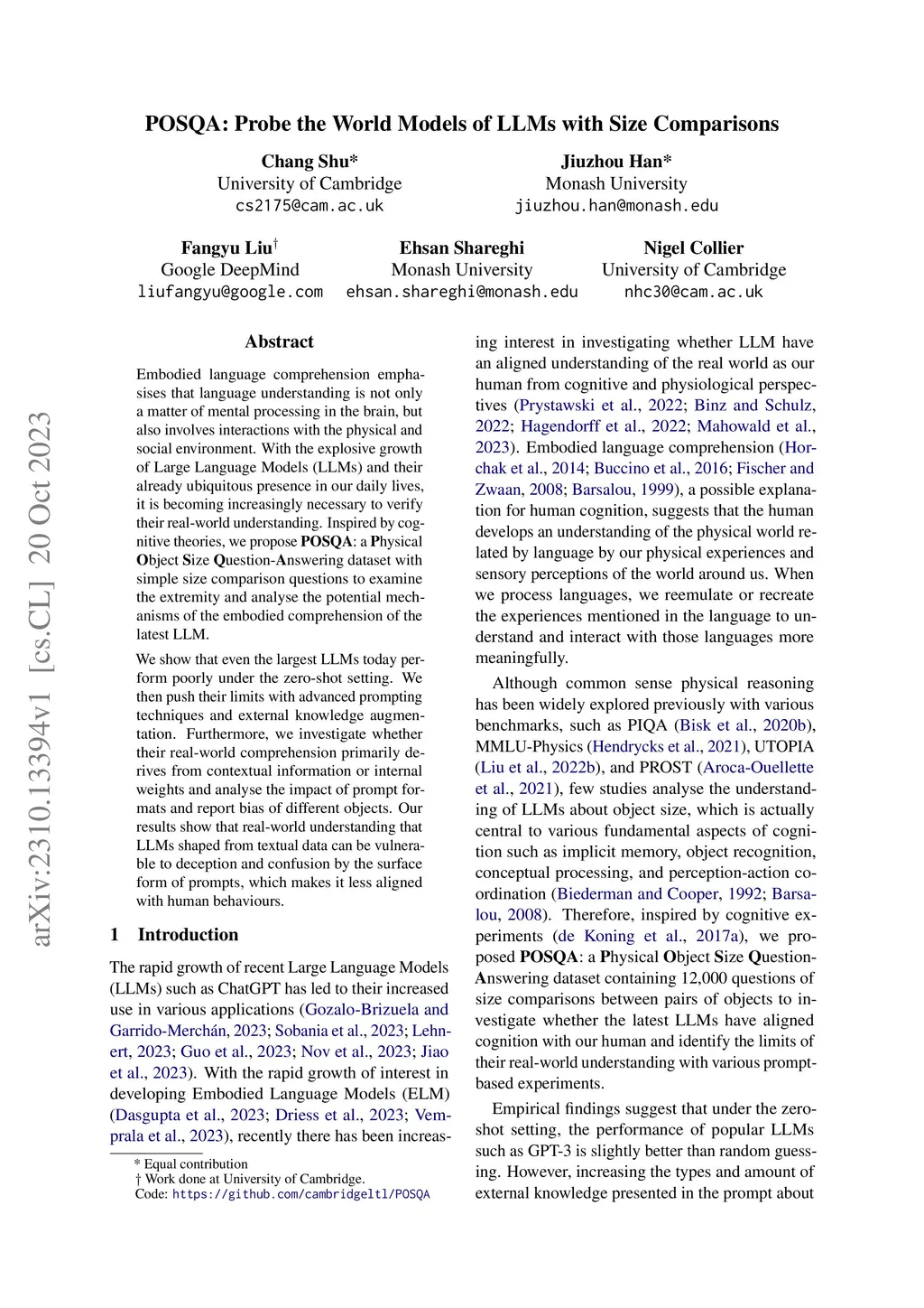 Embodied language comprehension emphasizes that language understanding is not solely a matter of mental processing in the brain but also involves interactions with the physical and social environment. With the explosive growth of Large Language Models (LLMs) and their already ubiquitous presence in our daily lives, it is becoming increasingly necessary to verify their real-world understanding. Inspired by cognitive theories, we propose POSQA: a Physical Object Size Question Answering dataset with simple size comparison questions to examine the extremity and analyze the potential mechanisms of the embodied comprehension of the latest LLMs. We show that even the largest LLMs today perform poorly under the zero-shot setting. We then push their limits with advanced prompting techniques and external knowledge augmentation. Furthermore, we investigate whether their real-world comprehension primarily derives from contextual information or internal weights and analyse the impact of prompt formats and report bias of different objects. Our results show that real-world understanding that LLMs shaped from textual data can be vulnerable to deception and confusion by the surface form of prompts, which makes it less aligned with human behaviours.