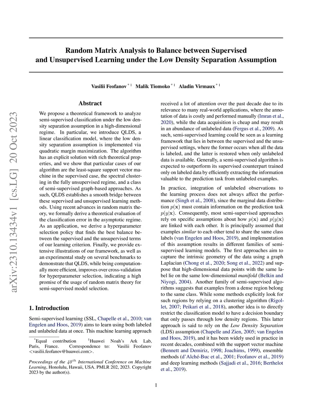 We propose a theoretical framework to analyze semi-supervised classification under the low density separation assumption in a high-dimensional regime. In particular, we introduce QLDS, a linear classification model, where the low density separation assumption is implemented via quadratic margin maximization. The algorithm has an explicit solution with rich theoretical properties, and we show that particular cases of our algorithm are the least-square support vector machine in the supervised case, the spectral clustering in the fully unsupervised regime, and a class of semi-supervised graph-based approaches. As such, QLDS establishes a smooth bridge between these supervised and unsupervised learning methods. Using recent advances in the random matrix theory, we formally derive a theoretical evaluation of the classification error in the asymptotic regime. As an application, we derive a hyperparameter selection policy that finds the best balance between the supervised and the unsupervised terms of our learning criterion. Finally, we provide extensive illustrations of our framework, as well as an experimental study on several benchmarks to demonstrate that QLDS, while being computationally more efficient, improves over cross-validation for hyperparameter selection, indicating a high promise of the usage of random matrix theory for semi-supervised model selection.