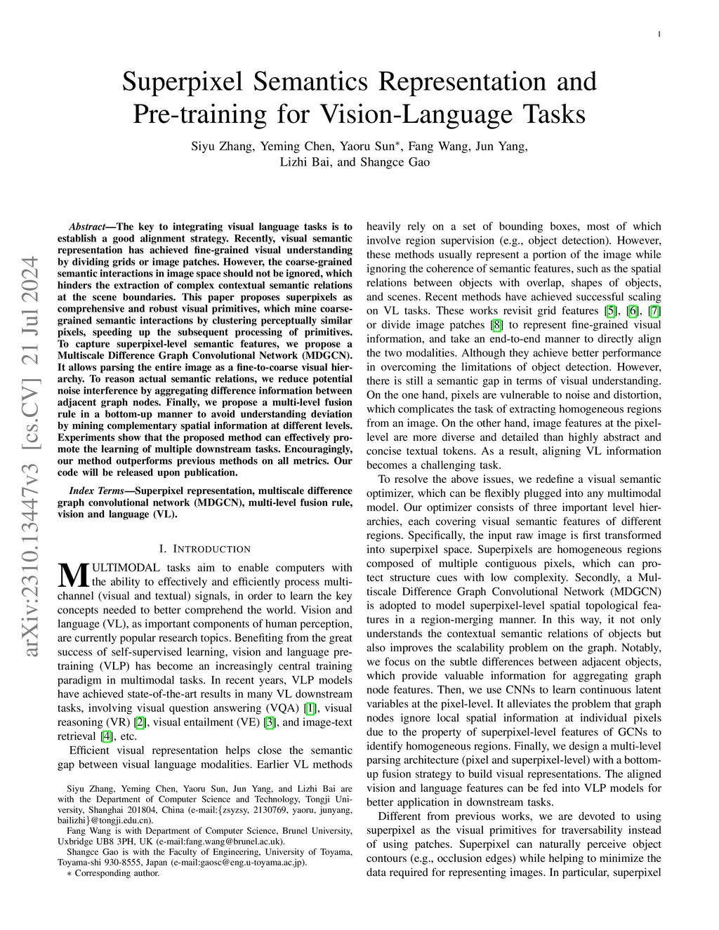 Within the multimodal field, the key to integrating vision and language lies in establishing a good alignment strategy. Recently, benefiting from the success of self-supervised learning, significant progress has been made in multimodal semantic representation based on pre-trained models for vision and language. However, there is still room for improvement in visual semantic representation. The lack of spatial semantic coherence and vulnerability to noise makes it challenging for current pixel or patch-based methods to accurately extract complex scene boundaries. To this end, this paper develops superpixel as a comprehensive compact representation of learnable image data, which effectively reduces the number of visual primitives for subsequent processing by clustering perceptually similar pixels. To mine more precise topological relations, we propose a Multiscale Difference Graph Convolutional Network (MDGCN). It parses the entire image as a fine-to-coarse hierarchical structure of constituent visual patterns, and captures multiscale features by progressively merging adjacent superpixels as graph nodes. Moreover, we predict the differences between adjacent nodes through the graph structure, facilitating key information aggregation of graph nodes to reason actual semantic relations. Afterward, we design a multi-level fusion rule in a bottom-up manner to avoid understanding deviation by learning complementary spatial information at different regional scales. Our proposed method can be well applied to multiple downstream task learning. Extensive experiments demonstrate that our method is competitive with other state-of-the-art methods in visual reasoning. Our code will be released upon publication.