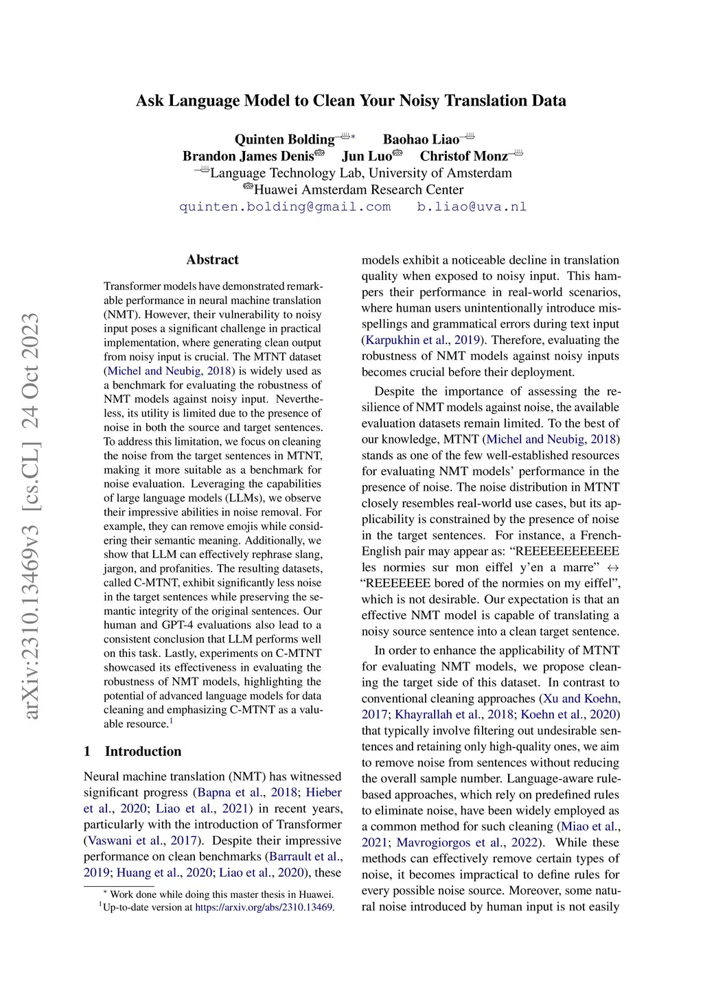 Transformer models have demonstrated remarkable performance in neural machine translation (NMT). However, their vulnerability to noisy input poses a significant challenge in practical implementation, where generating clean output from noisy input is crucial. The MTNT dataset is widely used as a benchmark for evaluating the robustness of NMT models against noisy input. Nevertheless, its utility is limited due to the presence of noise in both the source and target sentences. To address this limitation, we focus on cleaning the noise from the target sentences in MTNT, making it more suitable as a benchmark for noise evaluation. Leveraging the capabilities of large language models (LLMs), we observe their impressive abilities in noise removal. For example, they can remove emojis while considering their semantic meaning. Additionally, we show that LLM can effectively rephrase slang, jargon, and profanities. The resulting datasets, called C-MTNT, exhibit significantly less noise in the target sentences while preserving the semantic integrity of the original sentences. Our human and GPT-4 evaluations also lead to a consistent conclusion that LLM performs well on this task. Lastly, experiments on C-MTNT showcased its effectiveness in evaluating the robustness of NMT models, highlighting the potential of advanced language models for data cleaning and emphasizing C-MTNT as a valuable resource.