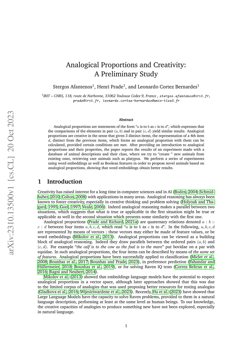 Analogical proportions are statements of the form " is to as is to ", which expresses that the comparisons of the elements in pair and in pair yield similar results. Analogical proportions are creative in the sense that given 3 distinct items, the representation of a 4th item , distinct from the previous items, which forms an analogical proportion with them can be calculated, provided certain conditions are met. After providing an introduction to analogical proportions and their properties, the paper reports the results of an experiment made with a database of animal descriptions and their class, where we try to "create" new animals from existing ones, retrieving rare animals such as platypus. We perform a series of experiments using word embeddings as well as Boolean features in order to propose novel animals based on analogical proportions, showing that word embeddings obtain better results.