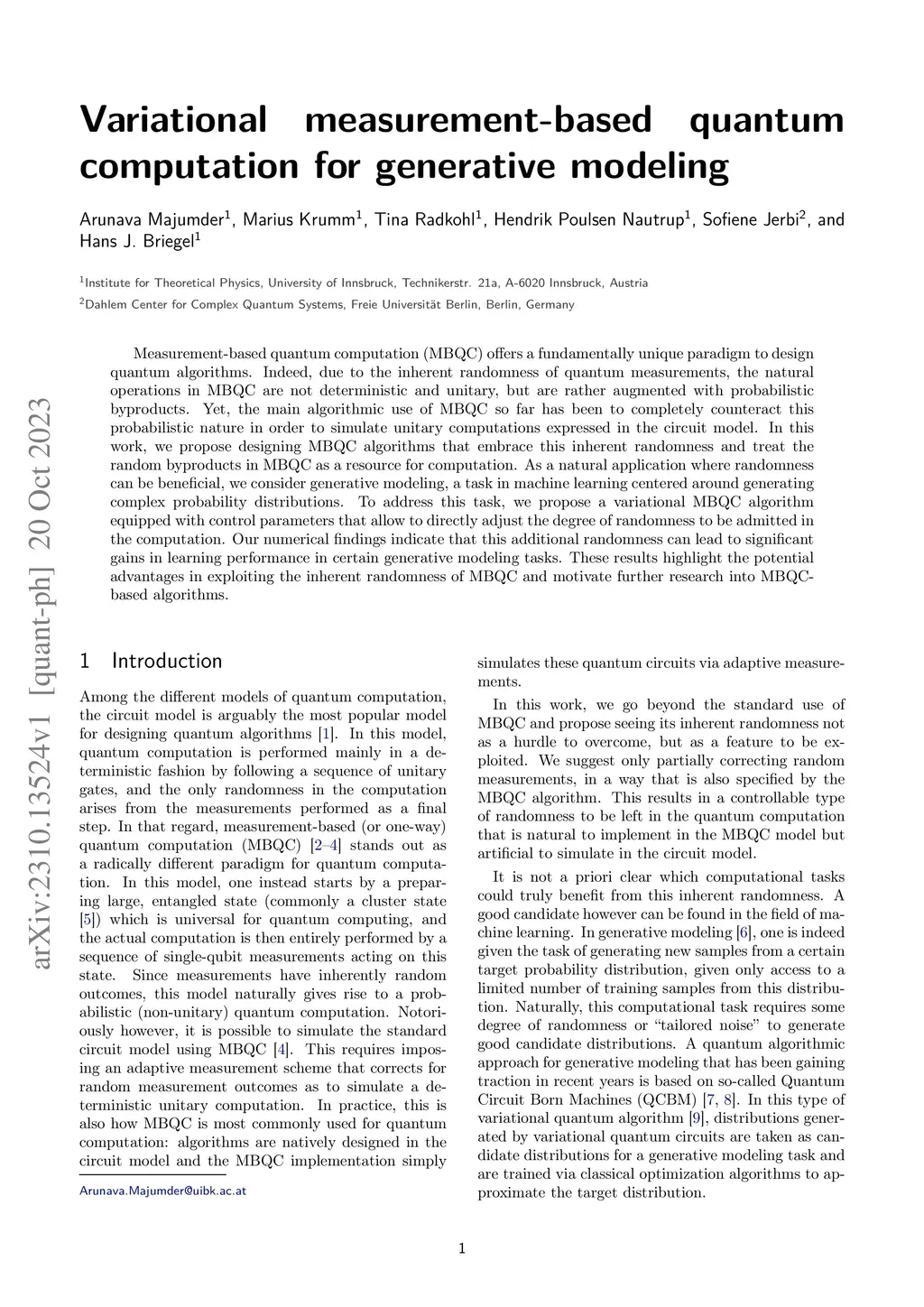 Measurement-based quantum computation (MBQC) offers a fundamentally unique paradigm to design quantum algorithms. Indeed, due to the inherent randomness of quantum measurements, the natural operations in MBQC are not deterministic and unitary, but are rather augmented with probabilistic byproducts. Yet, the main algorithmic use of MBQC so far has been to completely counteract this probabilistic nature in order to simulate unitary computations expressed in the circuit model. In this work, we propose designing MBQC algorithms that embrace this inherent randomness and treat the random byproducts in MBQC as a resource for computation. As a natural application where randomness can be beneficial, we consider generative modeling, a task in machine learning centered around generating complex probability distributions. To address this task, we propose a variational MBQC algorithm equipped with control parameters that allow to directly adjust the degree of randomness to be admitted in the computation. Our numerical findings indicate that this additional randomness can lead to significant gains in learning performance in certain generative modeling tasks. These results highlight the potential advantages in exploiting the inherent randomness of MBQC and motivate further research into MBQC-based algorithms.