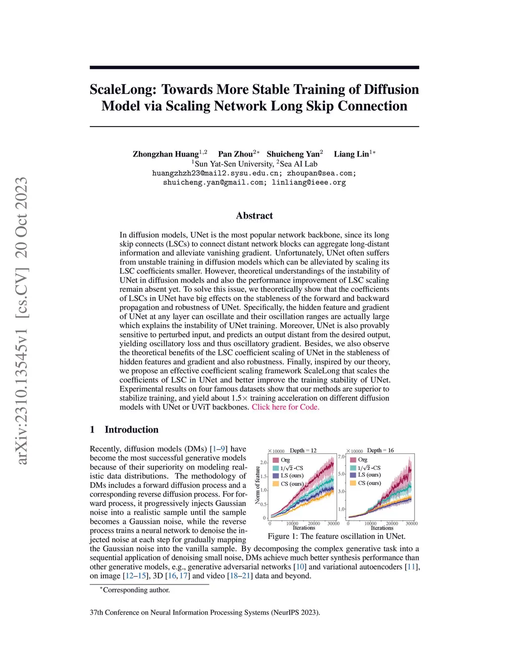 In diffusion models, UNet is the most popular network backbone, since its long skip connects (LSCs) to connect distant network blocks can aggregate long-distant information and alleviate vanishing gradient. Unfortunately, UNet often suffers from unstable training in diffusion models which can be alleviated by scaling its LSC coefficients smaller. However, theoretical understandings of the instability of UNet in diffusion models and also the performance improvement of LSC scaling remain absent yet. To solve this issue, we theoretically show that the coefficients of LSCs in UNet have big effects on the stableness of the forward and backward propagation and robustness of UNet. Specifically, the hidden feature and gradient of UNet at any layer can oscillate and their oscillation ranges are actually large which explains the instability of UNet training. Moreover, UNet is also provably sensitive to perturbed input, and predicts an output distant from the desired output, yielding oscillatory loss and thus oscillatory gradient. Besides, we also observe the theoretical benefits of the LSC coefficient scaling of UNet in the stableness of hidden features and gradient and also robustness. Finally, inspired by our theory, we propose an effective coefficient scaling framework ScaleLong that scales the coefficients of LSC in UNet and better improves the training stability of UNet. Experimental results on four famous datasets show that our methods are superior to stabilize training and yield about 1.5x training acceleration on different diffusion models with UNet or UViT backbones. Code: https://github.com/sail-sg/ScaleLong