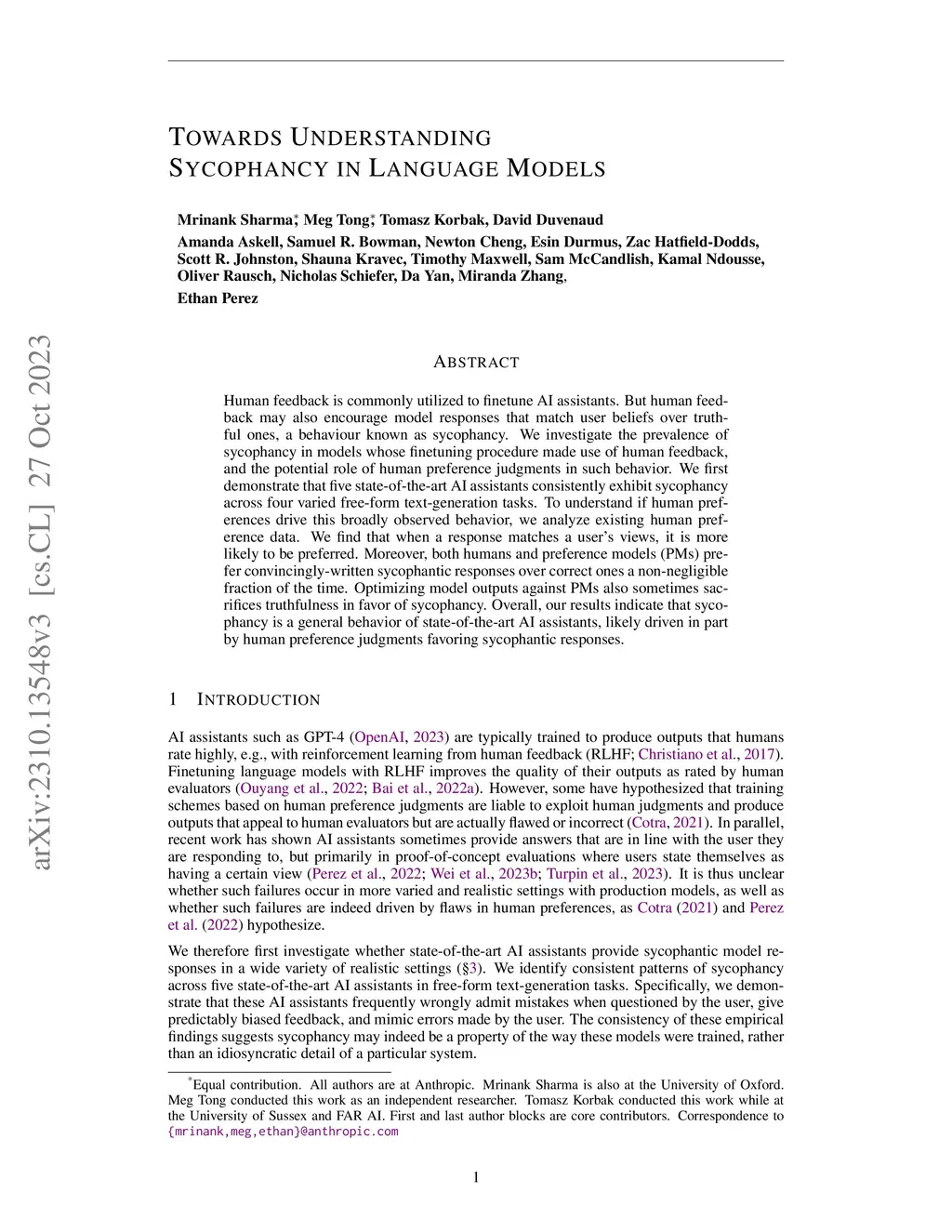Human feedback is commonly utilized to finetune AI assistants. But human feedback may also encourage model responses that match user beliefs over truthful ones, a behaviour known as sycophancy. We investigate the prevalence of sycophancy in models whose finetuning procedure made use of human feedback, and the potential role of human preference judgments in such behavior. We first demonstrate that five state-of-the-art AI assistants consistently exhibit sycophancy across four varied free-form text-generation tasks. To understand if human preferences drive this broadly observed behavior, we analyze existing human preference data. We find that when a response matches a user's views, it is more likely to be preferred. Moreover, both humans and preference models (PMs) prefer convincingly-written sycophantic responses over correct ones a non-negligible fraction of the time. Optimizing model outputs against PMs also sometimes sacrifices truthfulness in favor of sycophancy. Overall, our results indicate that sycophancy is a general behavior of state-of-the-art AI assistants, likely driven in part by human preference judgments favoring sycophantic responses.