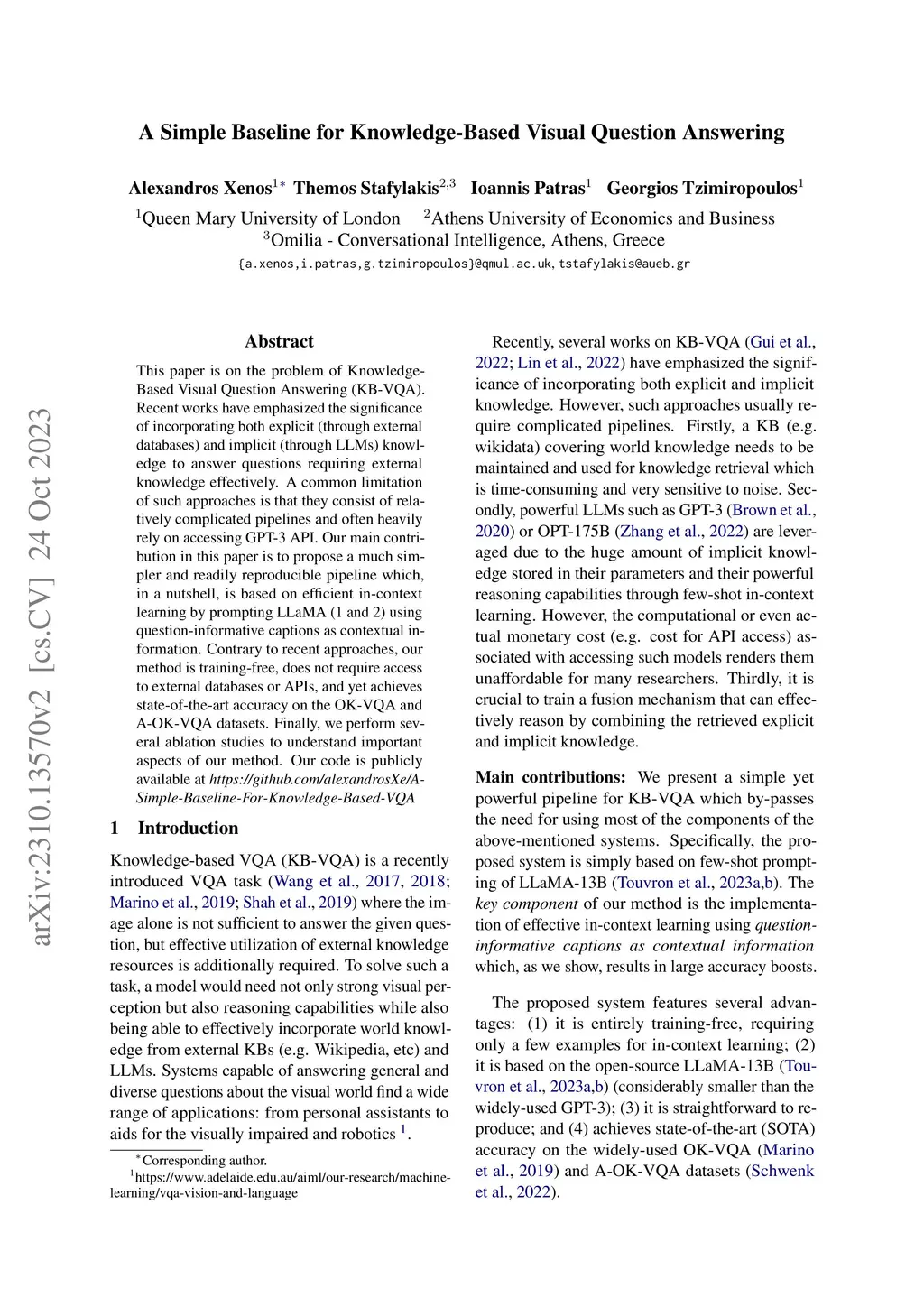 This paper is on the problem of Knowledge-Based Visual Question Answering (KB-VQA). Recent works have emphasized the significance of incorporating both explicit (through external databases) and implicit (through LLMs) knowledge to answer questions requiring external knowledge effectively. A common limitation of such approaches is that they consist of relatively complicated pipelines and often heavily rely on accessing GPT-3 API. Our main contribution in this paper is to propose a much simpler and readily reproducible pipeline which, in a nutshell, is based on efficient in-context learning by prompting LLaMA (1 and 2) using question-informative captions as contextual information. Contrary to recent approaches, our method is training-free, does not require access to external databases or APIs, and yet achieves state-of-the-art accuracy on the OK-VQA and A-OK-VQA datasets. Finally, we perform several ablation studies to understand important aspects of our method. Our code is publicly available at https://github.com/alexandrosXe/ASimple-Baseline-For-Knowledge-Based-VQA