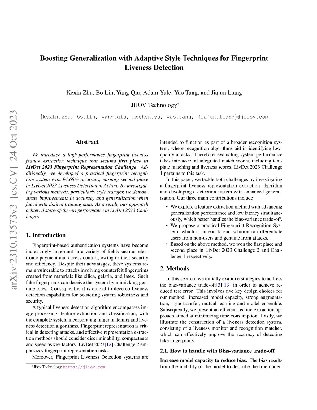 We introduce a high-performance fingerprint liveness feature extraction technique that secured first place in LivDet 2023 Fingerprint Representation Challenge. Additionally, we developed a practical fingerprint recognition system with 94.68% accuracy, earning second place in LivDet 2023 Liveness Detection in Action. By investigating various methods, particularly style transfer, we demonstrate improvements in accuracy and generalization when faced with limited training data. As a result, our approach achieved state-of-the-art performance in LivDet 2023 Challenges.