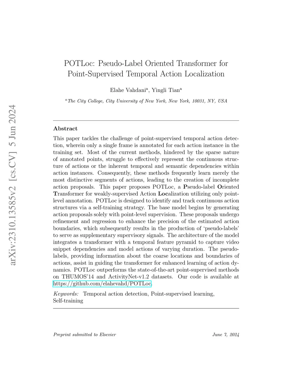 This paper tackles the challenge of point-supervised temporal action detection, wherein only a single frame is annotated for each action instance in the training set. Most of the current methods, hindered by the sparse nature of annotated points, struggle to effectively represent the continuous structure of actions or the inherent temporal and semantic dependencies within action instances. Consequently, these methods frequently learn merely the most distinctive segments of actions, leading to the creation of incomplete action proposals. This paper proposes POTLoc, a Pseudo-label Oriented Transformer for weakly-supervised Action Localization utilizing only point-level annotation. POTLoc is designed to identify and track continuous action structures via a self-training strategy. The base model begins by generating action proposals solely with point-level supervision. These proposals undergo refinement and regression to enhance the precision of the estimated action boundaries, which subsequently results in the production of `pseudo-labels' to serve as supplementary supervisory signals. The architecture of the model integrates a transformer with a temporal feature pyramid to capture video snippet dependencies and model actions of varying duration. The pseudo-labels, providing information about the coarse locations and boundaries of actions, assist in guiding the transformer for enhanced learning of action dynamics. POTLoc outperforms the state-of-the-art point-supervised methods on THUMOS'14 and ActivityNet-v1.2 datasets.