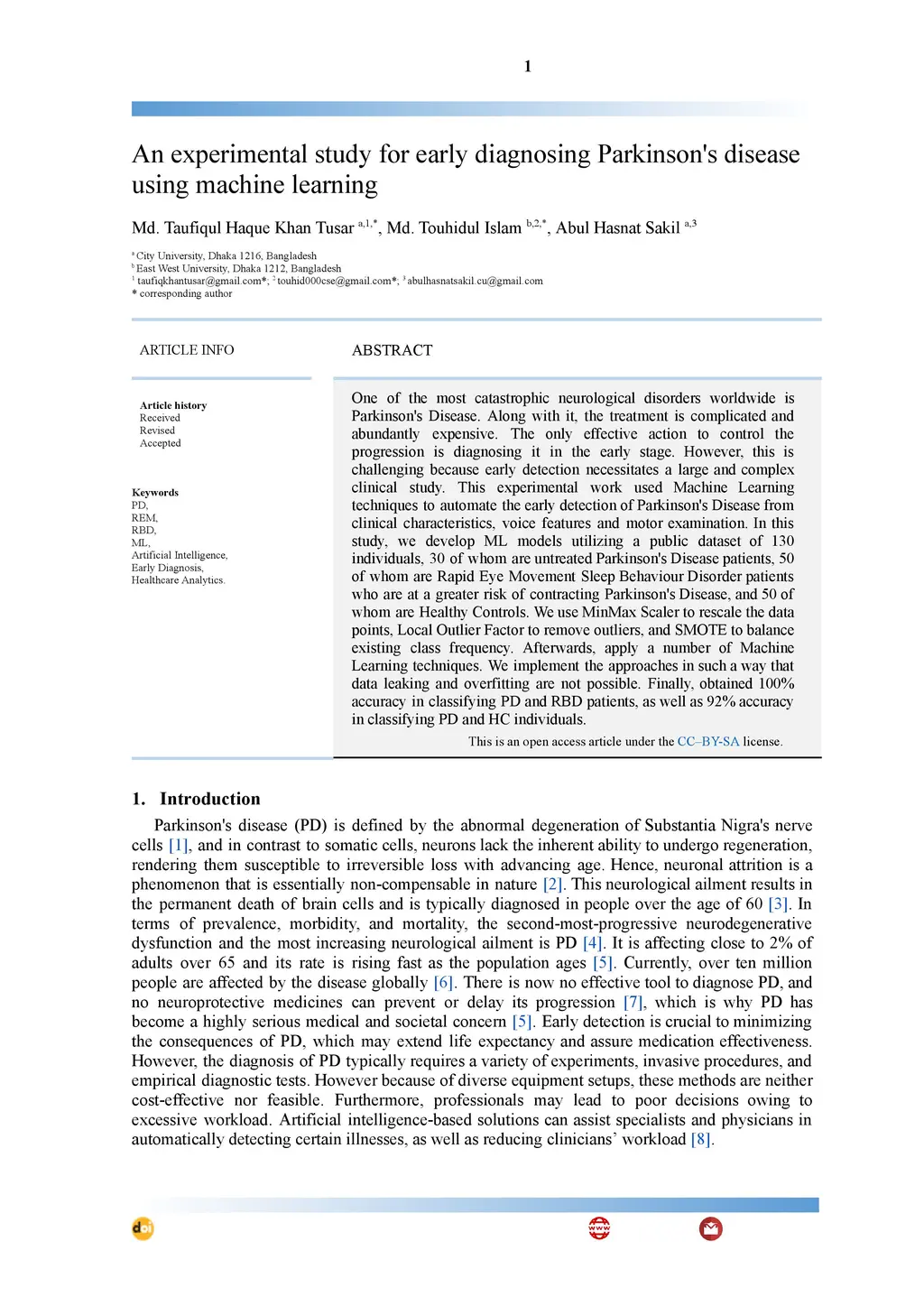 One of the most catastrophic neurological disorders worldwide is Parkinson's Disease. Along with it, the treatment is complicated and abundantly expensive. The only effective action to control the progression is diagnosing it in the early stage. However, this is challenging because early detection necessitates a large and complex clinical study. This experimental work used Machine Learning techniques to automate the early detection of Parkinson's Disease from clinical characteristics, voice features and motor examination. In this study, we develop ML models utilizing a public dataset of 130 individuals, 30 of whom are untreated Parkinson's Disease patients, 50 of whom are Rapid Eye Movement Sleep Behaviour Disorder patients who are at a greater risk of contracting Parkinson's Disease, and 50 of whom are Healthy Controls. We use MinMax Scaler to rescale the data points, Local Outlier Factor to remove outliers, and SMOTE to balance existing class frequency. Afterwards, apply a number of Machine Learning techniques. We implement the approaches in such a way that data leaking and overfitting are not possible. Finally, obtained 100% accuracy in classifying PD and RBD patients, as well as 92% accuracy in classifying PD and HC individuals.