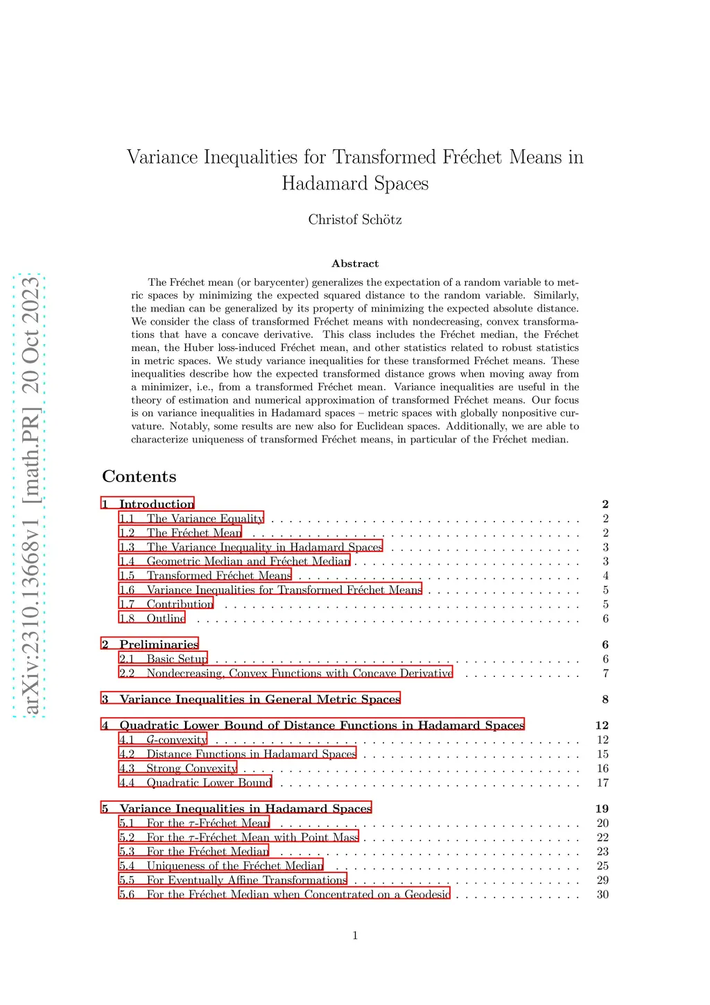The Fr\échet mean (or barycenter) generalizes the expectation of a random variable to metric spaces by minimizing the expected squared distance to the random variable. Similarly, the median can be generalized by its property of minimizing the expected absolute distance. We consider the class of transformed Fr\échet means with nondecreasing, convex transformations that have a concave derivative. This class includes the Fr\échet median, the Fr\échet mean, the Huber loss-induced Fr\échet mean, and other statistics related to robust statistics in metric spaces. We study variance inequalities for these transformed Fr\échet means. These inequalities describe how the expected transformed distance grows when moving away from a minimizer, i.e., from a transformed Fr\échet mean. Variance inequalities are useful in the theory of estimation and numerical approximation of transformed Fr\échet means. Our focus is on variance inequalities in Hadamard spaces - metric spaces with globally nonpositive curvature. Notably, some results are new also for Euclidean spaces. Additionally, we are able to characterize uniqueness of transformed Fr\échet means, in particular of the Fr\échet median.