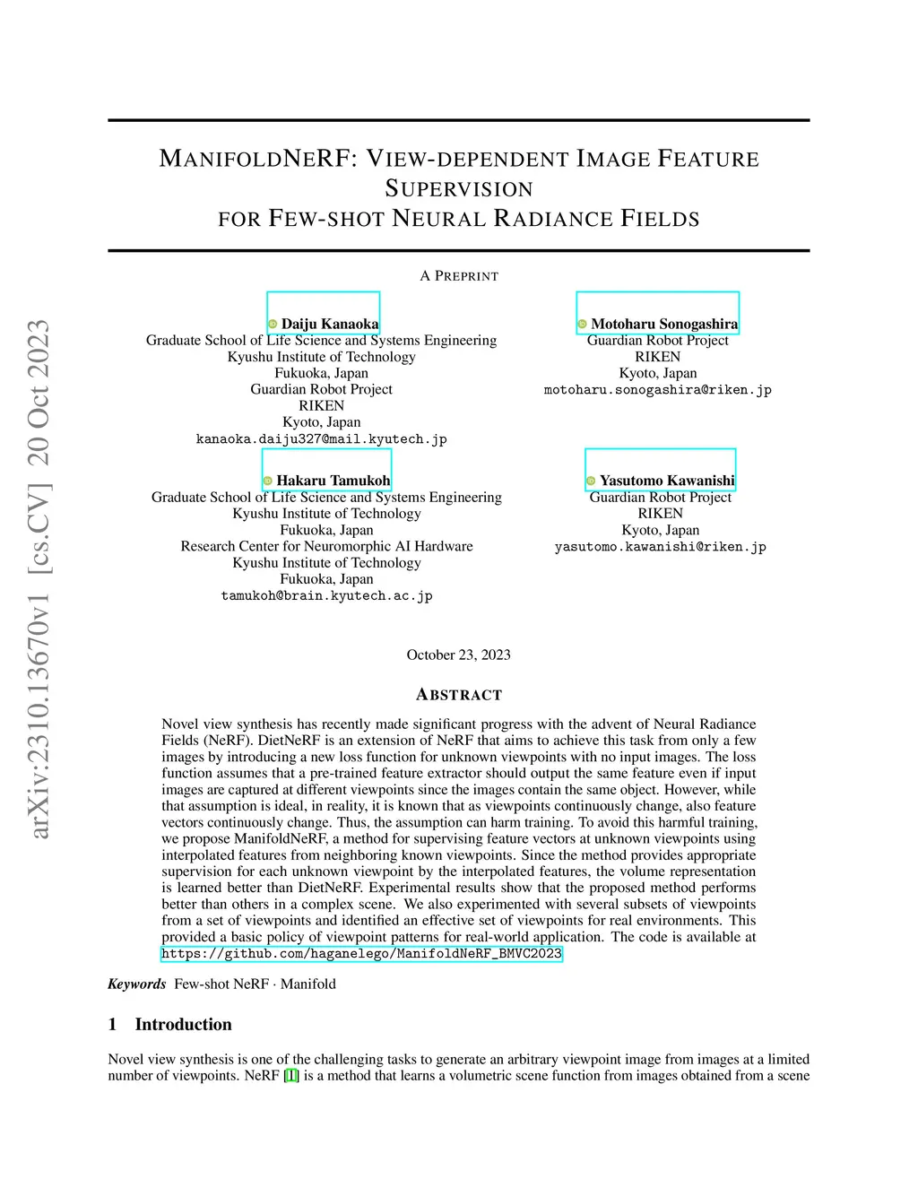 ManifoldNeRF: View-dependent Image Feature Supervision for Few-shot