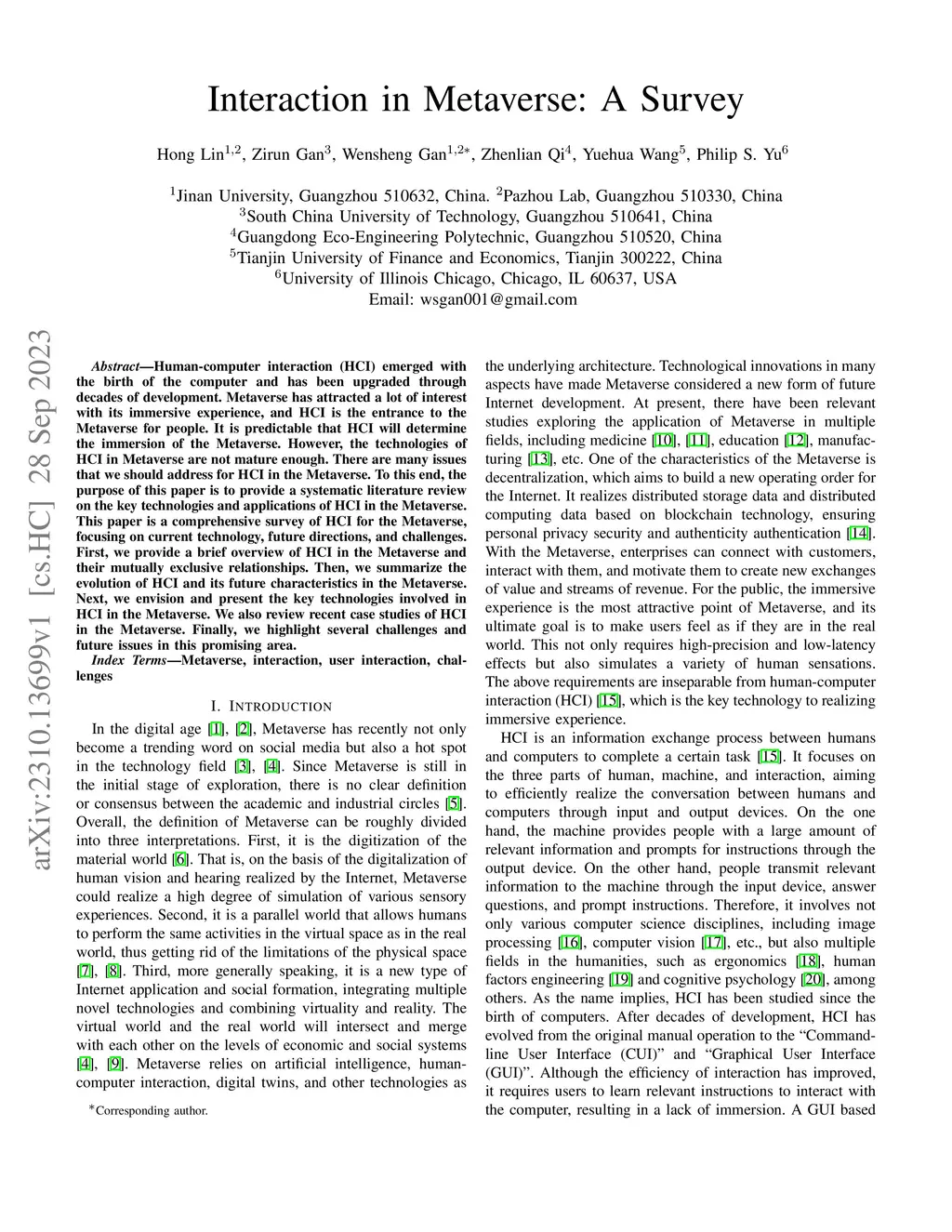 Human-computer interaction (HCI) emerged with the birth of the computer and has been upgraded through decades of development. Metaverse has attracted a lot of interest with its immersive experience, and HCI is the entrance to the Metaverse for people. It is predictable that HCI will determine the immersion of the Metaverse. However, the technologies of HCI in Metaverse are not mature enough. There are many issues that we should address for HCI in the Metaverse. To this end, the purpose of this paper is to provide a systematic literature review on the key technologies and applications of HCI in the Metaverse. This paper is a comprehensive survey of HCI for the Metaverse, focusing on current technology, future directions, and challenges. First, we provide a brief overview of HCI in the Metaverse and their mutually exclusive relationships. Then, we summarize the evolution of HCI and its future characteristics in the Metaverse. Next, we envision and present the key technologies involved in HCI in the Metaverse. We also review recent case studies of HCI in the Metaverse. Finally, we highlight several challenges and future issues in this promising area.