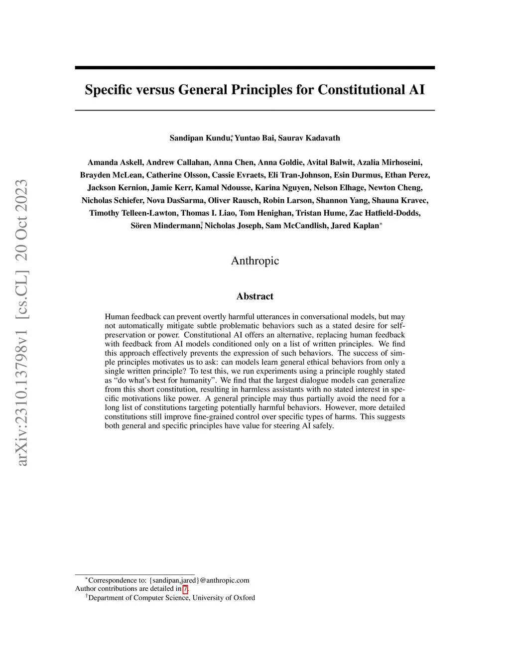 Human feedback can prevent overtly harmful utterances in conversational models, but may not automatically mitigate subtle problematic behaviors such as a stated desire for self-preservation or power. Constitutional AI offers an alternative, replacing human feedback with feedback from AI models conditioned only on a list of written principles. We find this approach effectively prevents the expression of such behaviors. The success of simple principles motivates us to ask: can models learn general ethical behaviors from only a single written principle? To test this, we run experiments using a principle roughly stated as "do what's best for humanity". We find that the largest dialogue models can generalize from this short constitution, resulting in harmless assistants with no stated interest in specific motivations like power. A general principle may thus partially avoid the need for a long list of constitutions targeting potentially harmful behaviors. However, more detailed constitutions still improve fine-grained control over specific types of harms. This suggests both general and specific principles have value for steering AI safely.