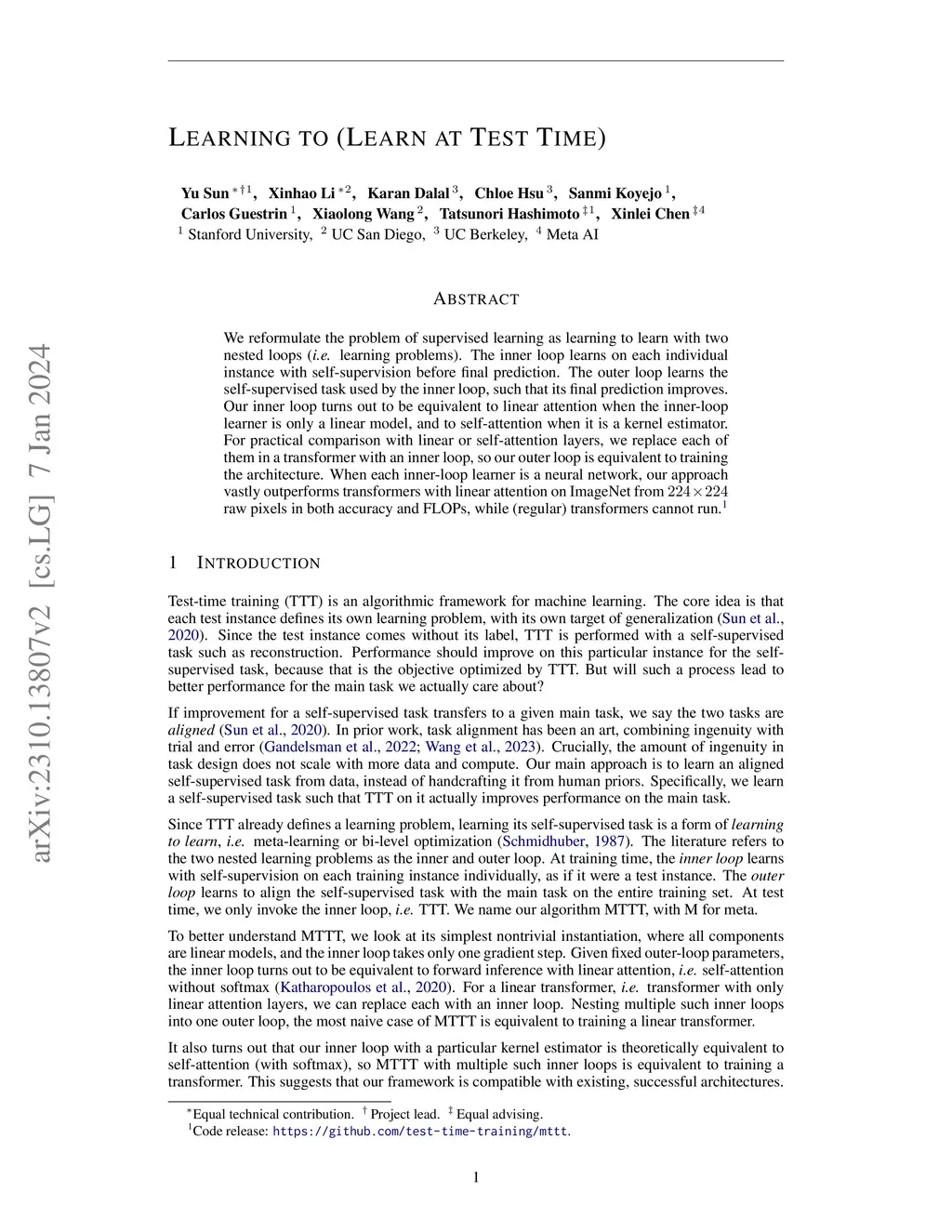 We reformulate the problem of supervised learning as learning to learn with two nested loops (i.e. learning problems). The inner loop learns on each individual instance with self-supervision before final prediction. The outer loop learns the self-supervised task used by the inner loop, such that its final prediction improves. Our inner loop turns out to be equivalent to linear attention when the inner-loop learner is only a linear model, and to self-attention when it is a kernel estimator. For practical comparison with linear or self-attention layers, we replace each of them in a transformer with an inner loop, so our outer loop is equivalent to training the architecture. When each inner-loop learner is a neural network, our approach vastly outperforms transformers with linear attention on ImageNet from 224 x 224 raw pixels in both accuracy and FLOPs, while (regular) transformers cannot run.