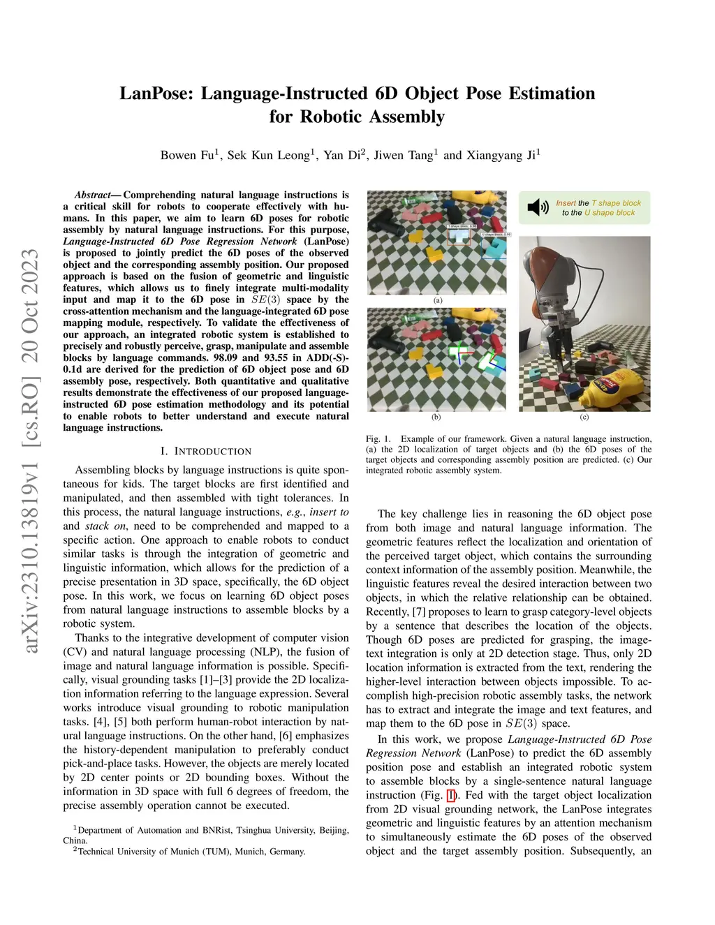 Comprehending natural language instructions is a critical skill for robots to cooperate effectively with humans. In this paper, we aim to learn 6D poses for roboticassembly by natural language instructions. For this purpose, Language-Instructed 6D Pose Regression Network (LanPose) is proposed to jointly predict the 6D poses of the observed object and the corresponding assembly position. Our proposed approach is based on the fusion of geometric and linguistic features, which allows us to finely integrate multi-modality input and map it to the 6D pose in SE(3) space by the cross-attention mechanism and the language-integrated 6D pose mapping module, respectively. To validate the effectiveness of our approach, an integrated robotic system is established to precisely and robustly perceive, grasp, manipulate and assemble blocks by language commands. 98.09 and 93.55 in ADD(-S)-0.1d are derived for the prediction of 6D object pose and 6D assembly pose, respectively. Both quantitative and qualitative results demonstrate the effectiveness of our proposed language-instructed 6D pose estimation methodology and its potential to enable robots to better understand and execute natural language instructions.