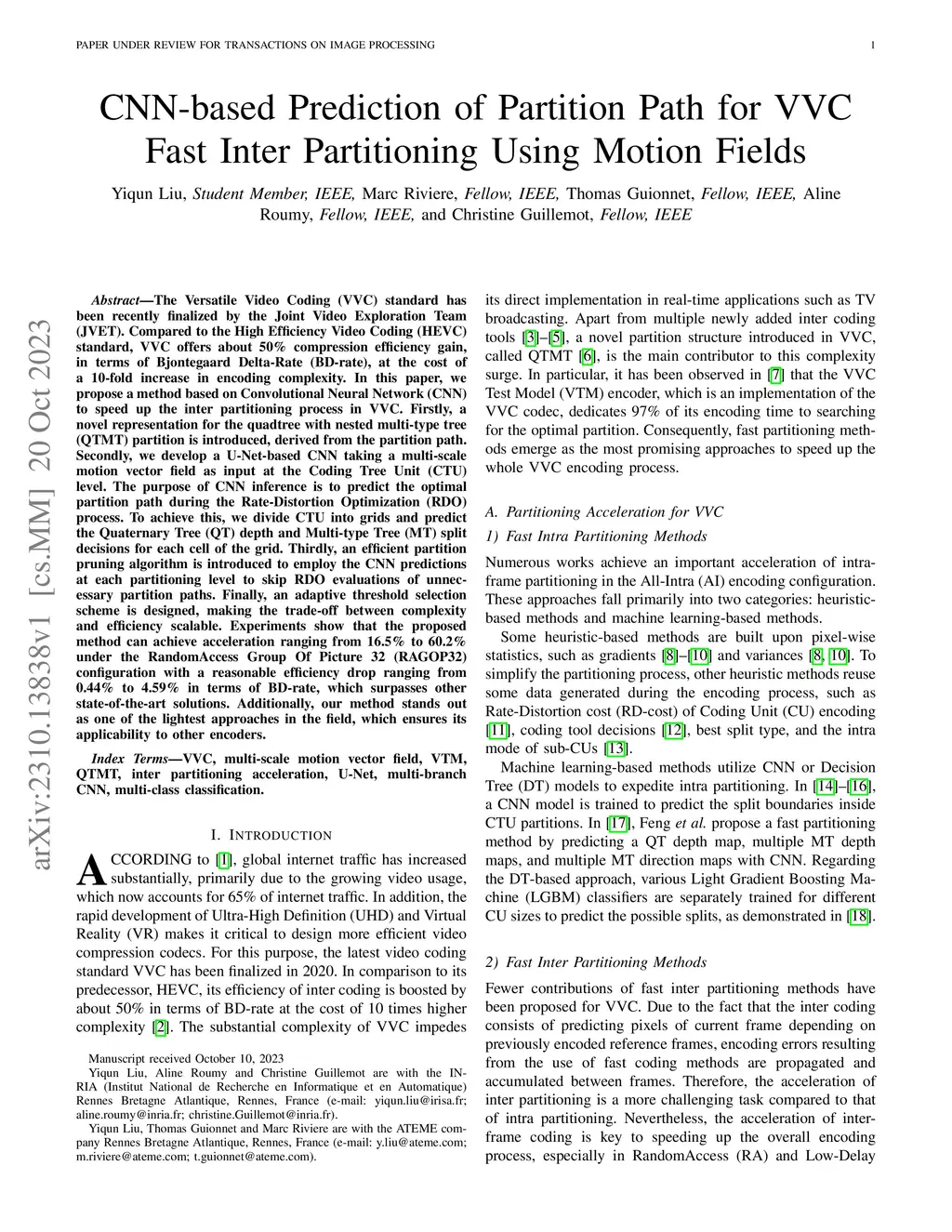 The Versatile Video Coding (VVC) standard has been recently finalized by the Joint Video Exploration Team (JVET). Compared to the High Efficiency Video Coding (HEVC) standard, VVC offers about 50% compression efficiency gain, in terms of Bjontegaard Delta-Rate (BD-rate), at the cost of a 10-fold increase in encoding complexity. In this paper, we propose a method based on Convolutional Neural Network (CNN) to speed up the inter partitioning process in VVC. Firstly, a novel representation for the quadtree with nested multi-type tree (QTMT) partition is introduced, derived from the partition path. Secondly, we develop a U-Net-based CNN taking a multi-scale motion vector field as input at the Coding Tree Unit (CTU) level. The purpose of CNN inference is to predict the optimal partition path during the Rate-Distortion Optimization (RDO) process. To achieve this, we divide CTU into grids and predict the Quaternary Tree (QT) depth and Multi-type Tree (MT) split decisions for each cell of the grid. Thirdly, an efficient partition pruning algorithm is introduced to employ the CNN predictions at each partitioning level to skip RDO evaluations of unnecessary partition paths. Finally, an adaptive threshold selection scheme is designed, making the trade-off between complexity and efficiency scalable. Experiments show that the proposed method can achieve acceleration ranging from 16.5% to 60.2% under the RandomAccess Group Of Picture 32 (RAGOP32) configuration with a reasonable efficiency drop ranging from 0.44% to 4.59% in terms of BD-rate, which surpasses other state-of-the-art solutions. Additionally, our method stands out as one of the lightest approaches in the field, which ensures its applicability to other encoders.
