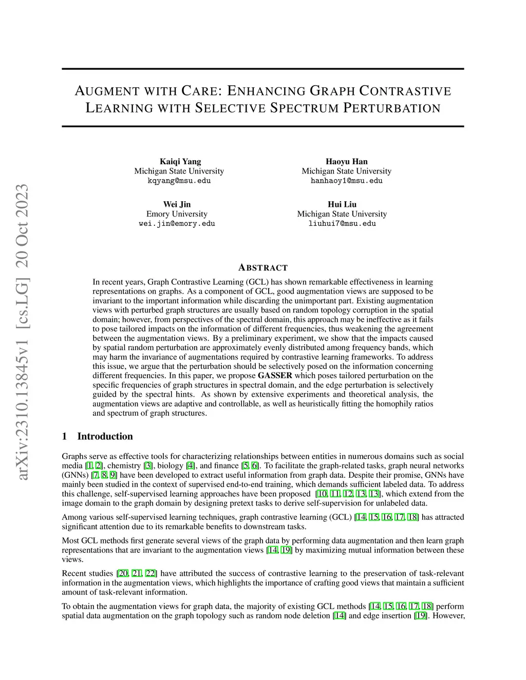 In recent years, Graph Contrastive Learning (GCL) has shown remarkable effectiveness in learning representations on graphs. As a component of GCL, good augmentation views are supposed to be invariant to the important information while discarding the unimportant part. Existing augmentation views with perturbed graph structures are usually based on random topology corruption in the spatial domain; however, from perspectives of the spectral domain, this approach may be ineffective as it fails to pose tailored impacts on the information of different frequencies, thus weakening the agreement between the augmentation views. By a preliminary experiment, we show that the impacts caused by spatial random perturbation are approximately evenly distributed among frequency bands, which may harm the invariance of augmentations required by contrastive learning frameworks. To address this issue, we argue that the perturbation should be selectively posed on the information concerning different frequencies. In this paper, we propose GASSER which poses tailored perturbation on the specific frequencies of graph structures in spectral domain, and the edge perturbation is selectively guided by the spectral hints. As shown by extensive experiments and theoretical analysis, the augmentation views are adaptive and controllable, as well as heuristically fitting the homophily ratios and spectrum of graph structures.