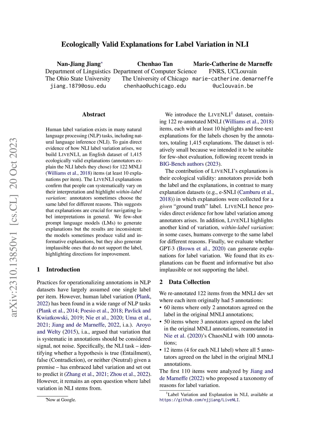 Ecologically Valid Explanations for Label Variation in NLI