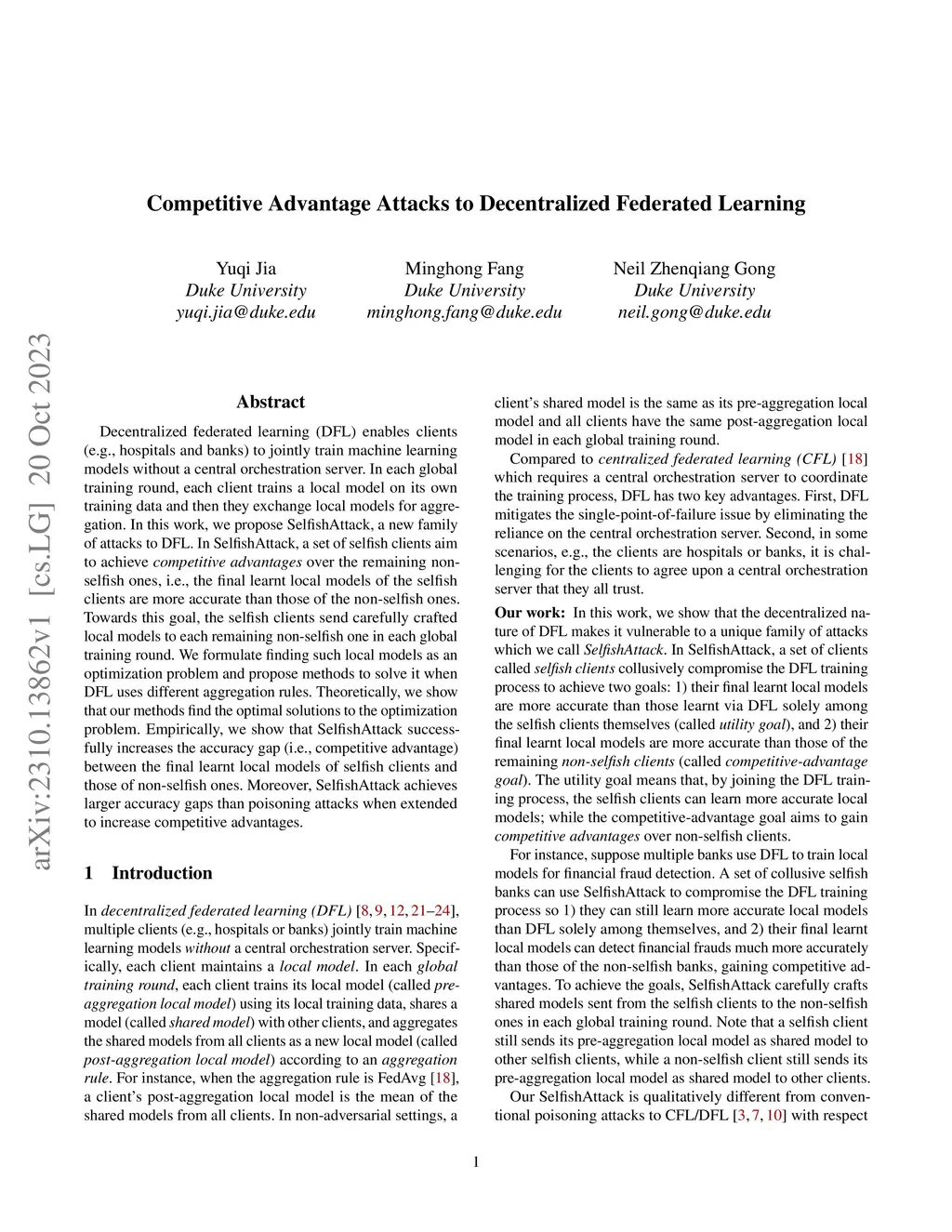 Decentralized federated learning (DFL) enables clients (e.g., hospitals and banks) to jointly train machine learning models without a central orchestration server. In each global training round, each client trains a local model on its own training data and then they exchange local models for aggregation. In this work, we propose SelfishAttack, a new family of attacks to DFL. In SelfishAttack, a set of selfish clients aim to achieve competitive advantages over the remaining non-selfish ones, i.e., the final learnt local models of the selfish clients are more accurate than those of the non-selfish ones. Towards this goal, the selfish clients send carefully crafted local models to each remaining non-selfish one in each global training round. We formulate finding such local models as an optimization problem and propose methods to solve it when DFL uses different aggregation rules. Theoretically, we show that our methods find the optimal solutions to the optimization problem. Empirically, we show that SelfishAttack successfully increases the accuracy gap (i.e., competitive advantage) between the final learnt local models of selfish clients and those of non-selfish ones. Moreover, SelfishAttack achieves larger accuracy gaps than poisoning attacks when extended to increase competitive advantages.