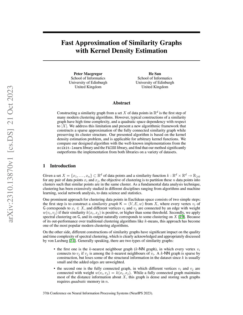 Constructing a similarity graph from a set of data points in is the first step of many modern clustering algorithms. However, typical constructions of a similarity graph have high time complexity, and a quadratic space dependency with respect to . We address this limitation and present a new algorithmic framework that constructs a sparse approximation of the fully connected similarity graph while preserving its cluster structure. Our presented algorithm is based on the kernel density estimation problem, and is applicable for arbitrary kernel functions. We compare our designed algorithm with the well-known implementations from the scikit-learn library and the FAISS library, and find that our method significantly outperforms the implementation from both libraries on a variety of datasets.