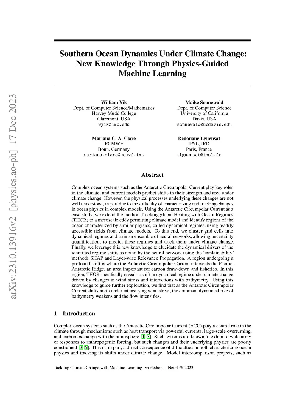 Complex ocean systems such as the Antarctic Circumpolar Current play key roles in the climate, and current models predict shifts in their strength and area under climate change. However, the physical processes underlying these changes are not well understood, in part due to the difficulty of characterizing and tracking changes in ocean physics in complex models. Using the Antarctic Circumpolar Current as a case study, we extend the method Tracking global Heating with Ocean Regimes (THOR) to a mesoscale eddy permitting climate model and identify regions of the ocean characterized by similar physics, called dynamical regimes, using readily accessible fields from climate models. To this end, we cluster grid cells into dynamical regimes and train an ensemble of neural networks, allowing uncertainty quantification, to predict these regimes and track them under climate change. Finally, we leverage this new knowledge to elucidate the dynamical drivers of the identified regime shifts as noted by the neural network using the éxplainability' methods SHAP and Layer-wise Relevance Propagation. A region undergoing a profound shift is where the Antarctic Circumpolar Current intersects the Pacific-Antarctic Ridge, an area important for carbon draw-down and fisheries. In this region, THOR specifically reveals a shift in dynamical regime under climate change driven by changes in wind stress and interactions with bathymetry. Using this knowledge to guide further exploration, we find that as the Antarctic Circumpolar Current shifts north under intensifying wind stress, the dominant dynamical role of bathymetry weakens and the flow intensifies.