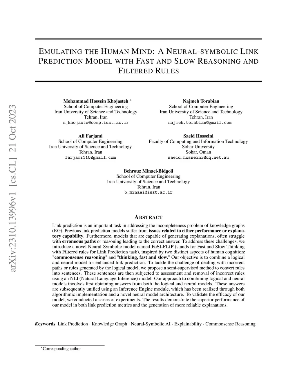 Link prediction is an important task in addressing the incompleteness problem of knowledge graphs (KG). Previous link prediction models suffer from issues related to either performance or explanatory capability. Furthermore, models that are capable of generating explanations, often struggle with erroneous paths or reasoning leading to the correct answer. To address these challenges, we introduce a novel Neural-Symbolic model named FaSt-FLiP (stands for Fast and Slow Thinking with Filtered rules for Link Prediction task), inspired by two distinct aspects of human cognition: "commonsense reasoning" and "thinking, fast and slow." Our objective is to combine a logical and neural model for enhanced link prediction. To tackle the challenge of dealing with incorrect paths or rules generated by the logical model, we propose a semi-supervised method to convert rules into sentences. These sentences are then subjected to assessment and removal of incorrect rules using an NLI (Natural Language Inference) model. Our approach to combining logical and neural models involves first obtaining answers from both the logical and neural models. These answers are subsequently unified using an Inference Engine module, which has been realized through both algorithmic implementation and a novel neural model architecture. To validate the efficacy of our model, we conducted a series of experiments. The results demonstrate the superior performance of our model in both link prediction metrics and the generation of more reliable explanations.