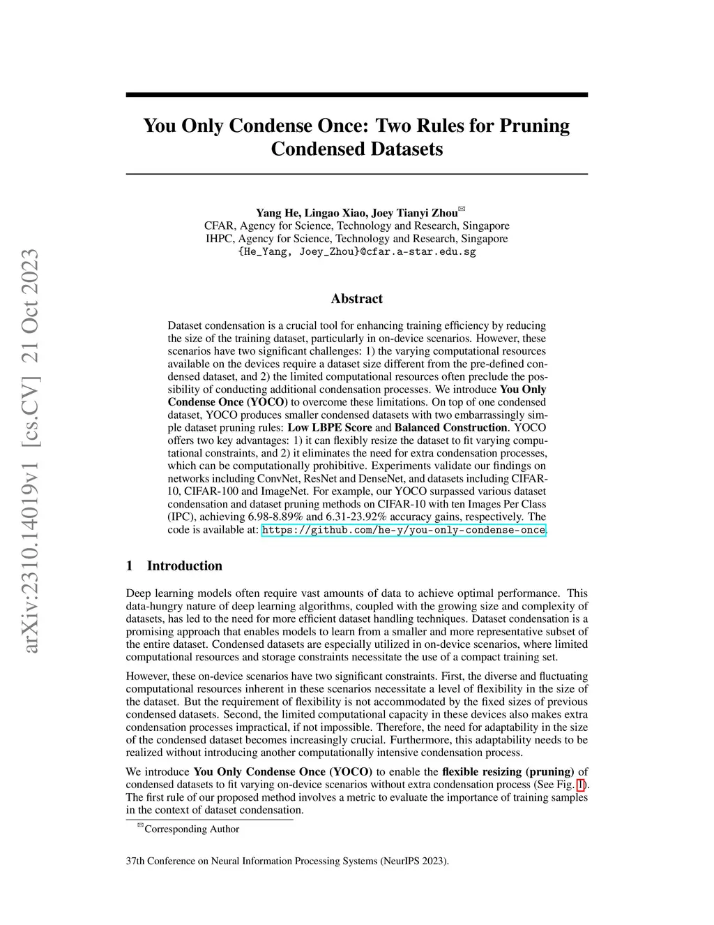 Dataset condensation is a crucial tool for enhancing training efficiency by reducing the size of the training dataset, particularly in on-device scenarios. However, these scenarios have two significant challenges: 1) the varying computational resources available on the devices require a dataset size different from the pre-defined condensed dataset, and 2) the limited computational resources often preclude the possibility of conducting additional condensation processes. We introduce You Only Condense Once (YOCO) to overcome these limitations. On top of one condensed dataset, YOCO produces smaller condensed datasets with two embarrassingly simple dataset pruning rules: Low LBPE Score and Balanced Construction. YOCO offers two key advantages: 1) it can flexibly resize the dataset to fit varying computational constraints, and 2) it eliminates the need for extra condensation processes, which can be computationally prohibitive. Experiments validate our findings on networks including ConvNet, ResNet and DenseNet, and datasets including CIFAR-10, CIFAR-100 and ImageNet. For example, our YOCO surpassed various dataset condensation and dataset pruning methods on CIFAR-10 with ten Images Per Class (IPC), achieving 6.98-8.89% and 6.31-23.92% accuracy gains, respectively. The code is available at: https://github.com/he-y/you-only-condense-once.
