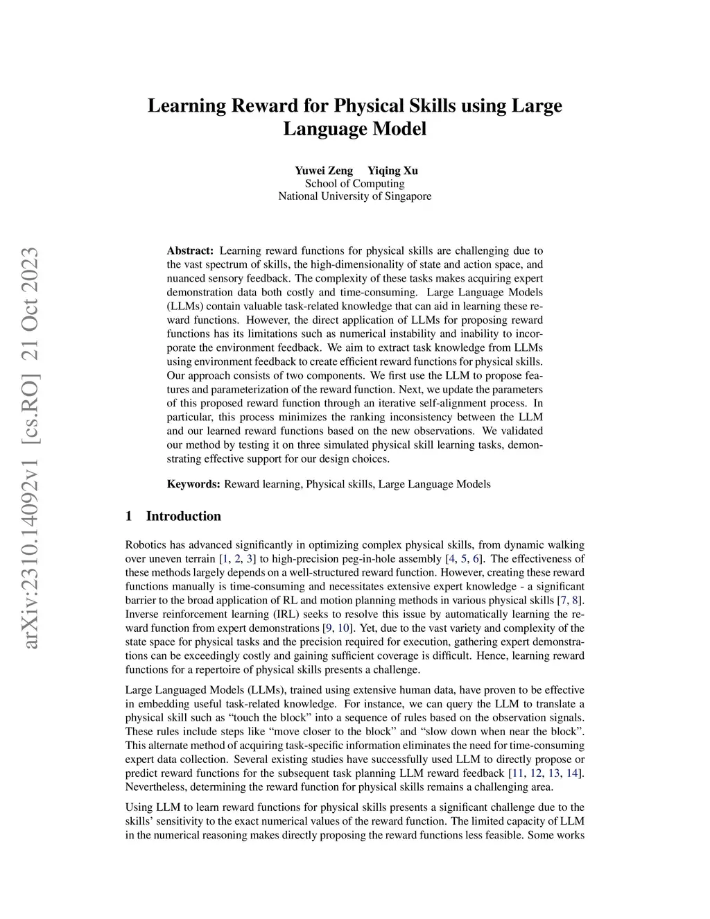 Learning reward functions for physical skills are challenging due to the vast spectrum of skills, the high-dimensionality of state and action space, and nuanced sensory feedback. The complexity of these tasks makes acquiring expert demonstration data both costly and time-consuming. Large Language Models (LLMs) contain valuable task-related knowledge that can aid in learning these reward functions. However, the direct application of LLMs for proposing reward functions has its limitations such as numerical instability and inability to incorporate the environment feedback. We aim to extract task knowledge from LLMs using environment feedback to create efficient reward functions for physical skills. Our approach consists of two components. We first use the LLM to propose features and parameterization of the reward function. Next, we update the parameters of this proposed reward function through an iterative self-alignment process. In particular, this process minimizes the ranking inconsistency between the LLM and our learned reward functions based on the new observations. We validated our method by testing it on three simulated physical skill learning tasks, demonstrating effective support for our design choices.