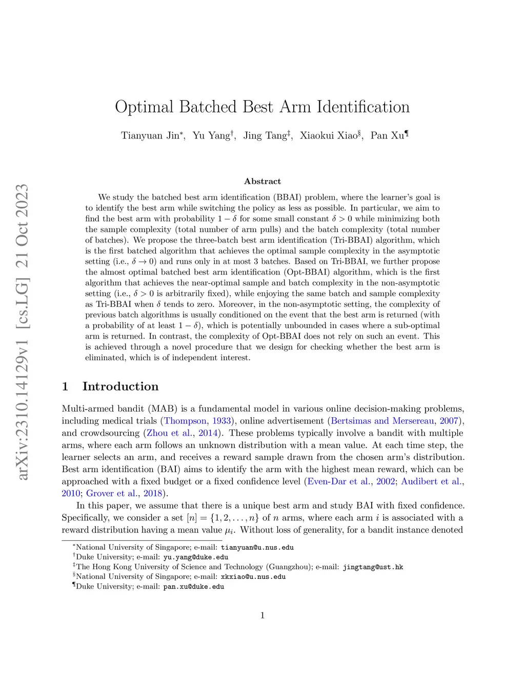 We study the batched best arm identification (BBAI) problem, where the learner's goal is to identify the best arm while switching the policy as less as possible. In particular, we aim to find the best arm with probability for some small constant while minimizing both the sample complexity (total number of arm pulls) and the batch complexity (total number of batches). We propose the three-batch best arm identification (Tri-BBAI) algorithm, which is the first batched algorithm that achieves the optimal sample complexity in the asymptotic setting (i.e., ) and runs in batches in expectation. Based on Tri-BBAI, we further propose the almost optimal batched best arm identification (Opt-BBAI) algorithm, which is the first algorithm that achieves the near-optimal sample and batch complexity in the non-asymptotic setting (i.e., is finite), while enjoying the same batch and sample complexity as Tri-BBAI when tends to zero. Moreover, in the non-asymptotic setting, the complexity of previous batch algorithms is usually conditioned on the event that the best arm is returned (with a probability of at least ), which is potentially unbounded in cases where a sub-optimal arm is returned. In contrast, the complexity of Opt-BBAI does not rely on such an event. This is achieved through a novel procedure that we design for checking whether the best arm is eliminated, which is of independent interest.