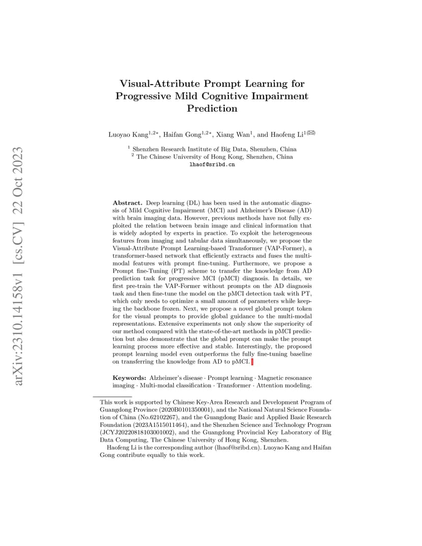 Deep learning (DL) has been used in the automatic diagnosis of Mild Cognitive Impairment (MCI) and Alzheimer's Disease (AD) with brain imaging data. However, previous methods have not fully exploited the relation between brain image and clinical information that is widely adopted by experts in practice. To exploit the heterogeneous features from imaging and tabular data simultaneously, we propose the Visual-Attribute Prompt Learning-based Transformer (VAP-Former), a transformer-based network that efficiently extracts and fuses the multi-modal features with prompt fine-tuning. Furthermore, we propose a Prompt fine-Tuning (PT) scheme to transfer the knowledge from AD prediction task for progressive MCI (pMCI) diagnosis. In details, we first pre-train the VAP-Former without prompts on the AD diagnosis task and then fine-tune the model on the pMCI detection task with PT, which only needs to optimize a small amount of parameters while keeping the backbone frozen. Next, we propose a novel global prompt token for the visual prompts to provide global guidance to the multi-modal representations. Extensive experiments not only show the superiority of our method compared with the state-of-the-art methods in pMCI prediction but also demonstrate that the global prompt can make the prompt learning process more effective and stable. Interestingly, the proposed prompt learning model even outperforms the fully fine-tuning baseline on transferring the knowledge from AD to pMCI.
