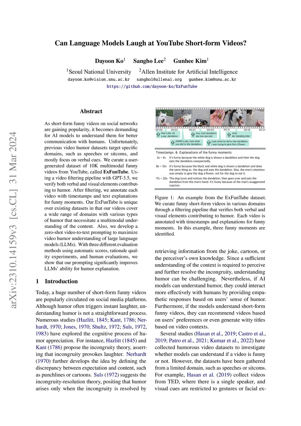 As short-form funny videos on social networks are gaining popularity, it becomes demanding for AI models to understand them for better communication with humans. Unfortunately, previous video humor datasets target specific domains, such as speeches or sitcoms, and mostly focus on verbal cues. We curate a user-generated dataset of 10K multimodal funny videos from YouTube, called ExFunTube. Using a video filtering pipeline with GPT-3.5, we verify both verbal and visual elements contributing to humor. After filtering, we annotate each video with timestamps and text explanations for funny moments. Our ExFunTube is unique over existing datasets in that our videos cover a wide range of domains with various types of humor that necessitate a multimodal understanding of the content. Also, we develop a zero-shot video-to-text prompting to maximize video humor understanding of large language models (LLMs). With three different evaluation methods using automatic scores, rationale quality experiments, and human evaluations, we show that our prompting significantly improves LLMs' ability for humor explanation.
