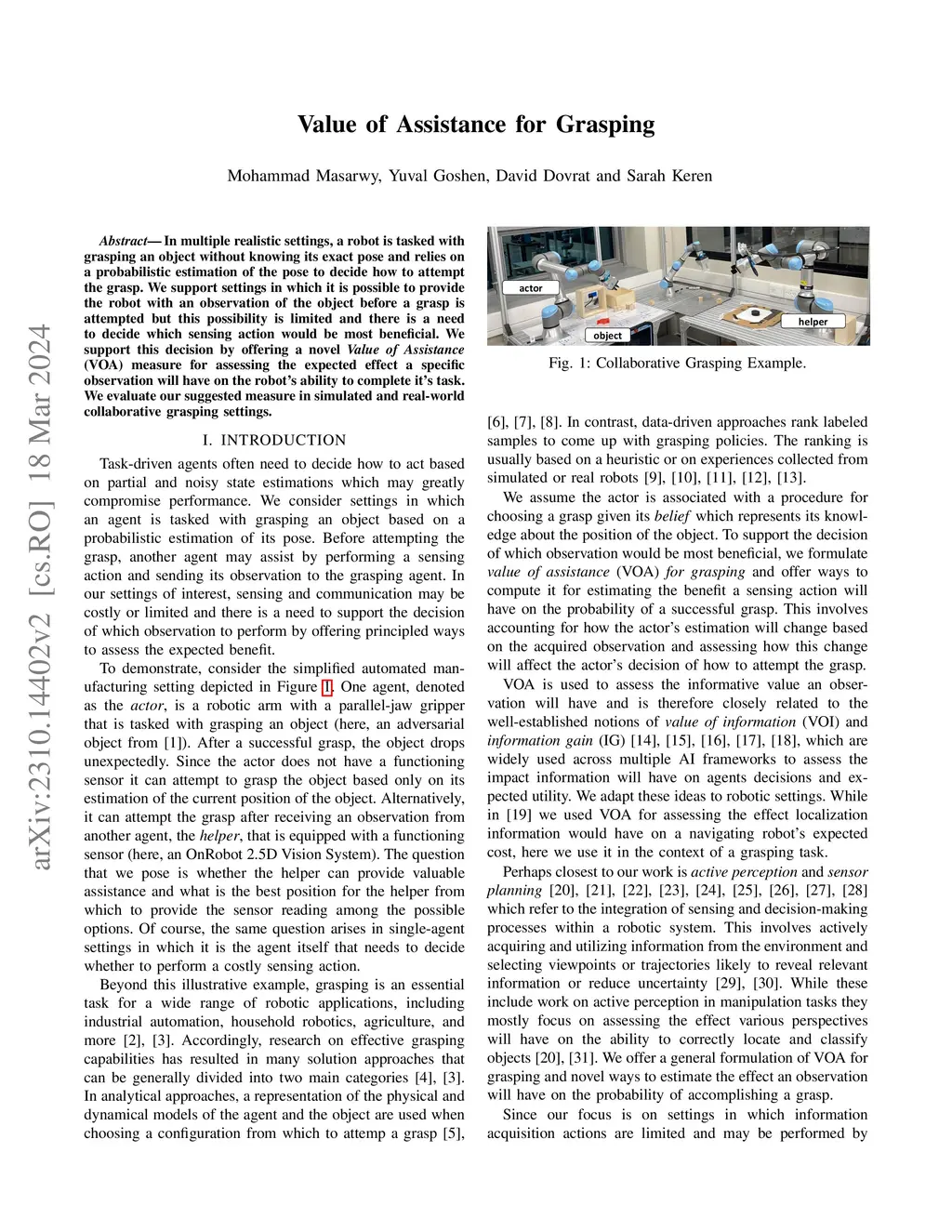 In multiple realistic settings, a robot is tasked with grasping an object without knowing its exact pose and relies on a probabilistic estimation of the pose to decide how to attempt the grasp. We support settings in which it is possible to provide the robot with an observation of the object before a grasp is attempted but this possibility is limited and there is a need to decide which sensing action would be most beneficial. We support this decision by offering a novel Value of Assistance (VOA) measure for assessing the expected effect a specific observation will have on the robot's ability to complete its task. We evaluate our suggested measure in simulated and real-world collaborative grasping settings.